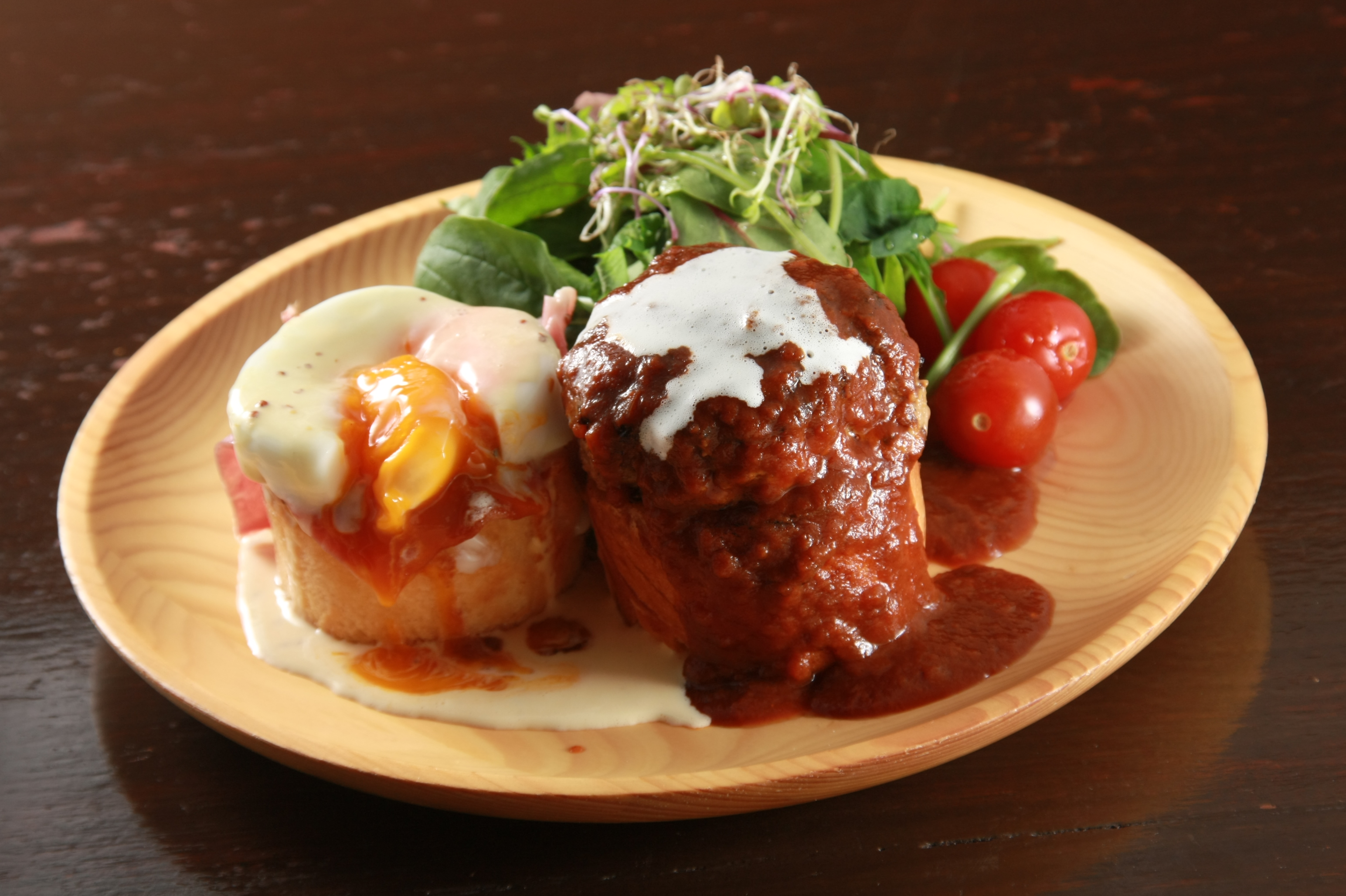 【エッグベネディクト】(1070円) 「新食缶ベーカリー」のミルク味に、デミグラスハンバーグを添えて