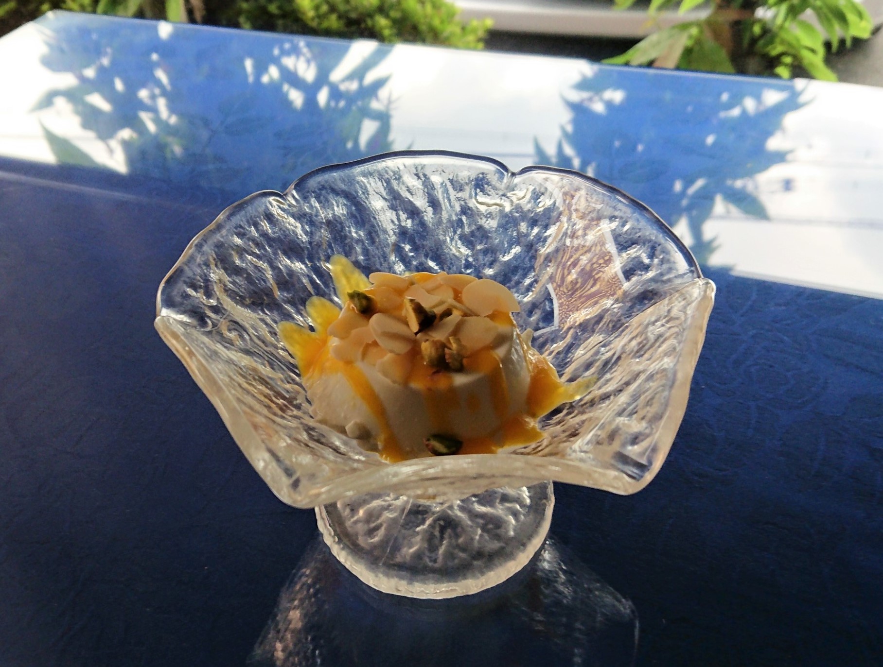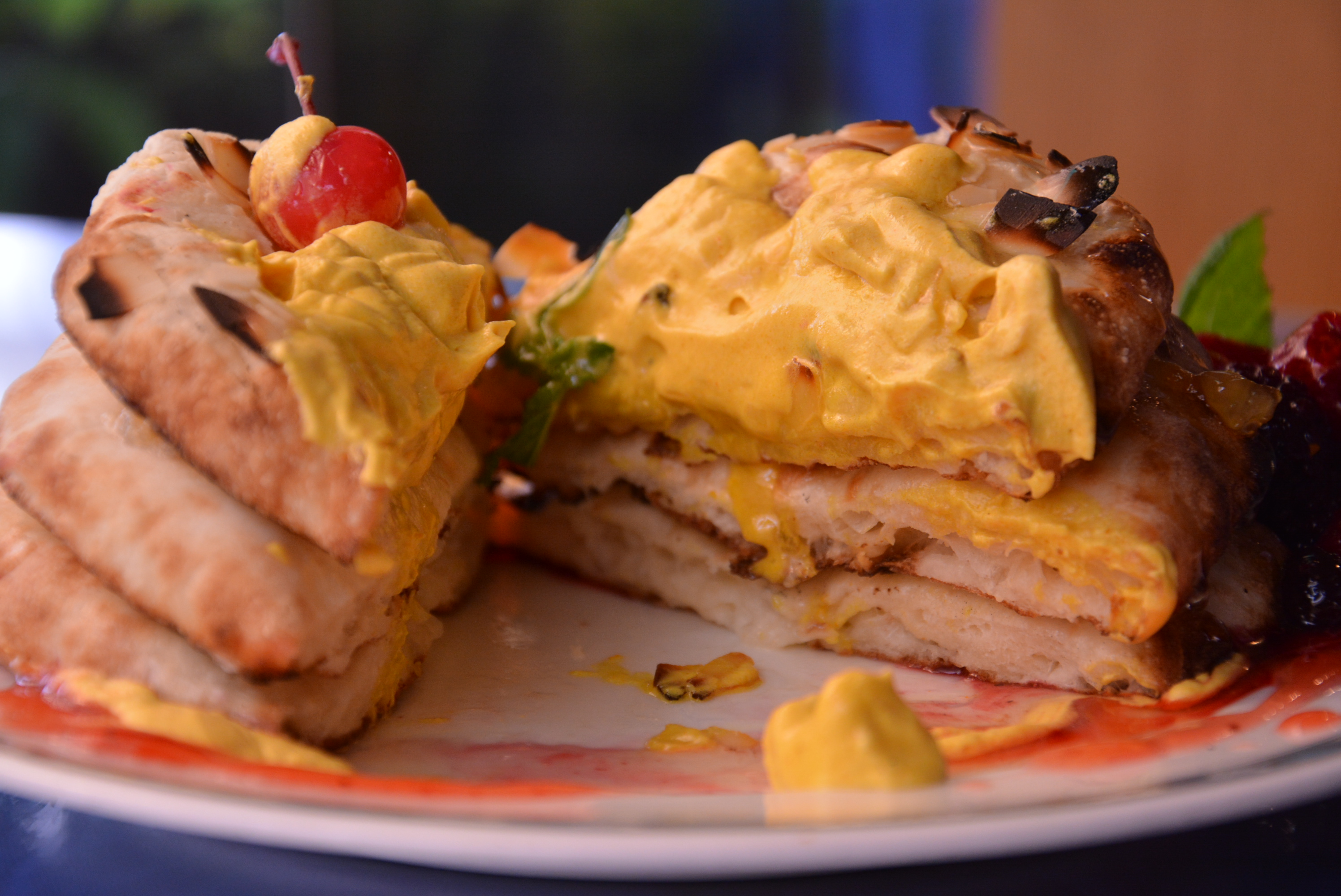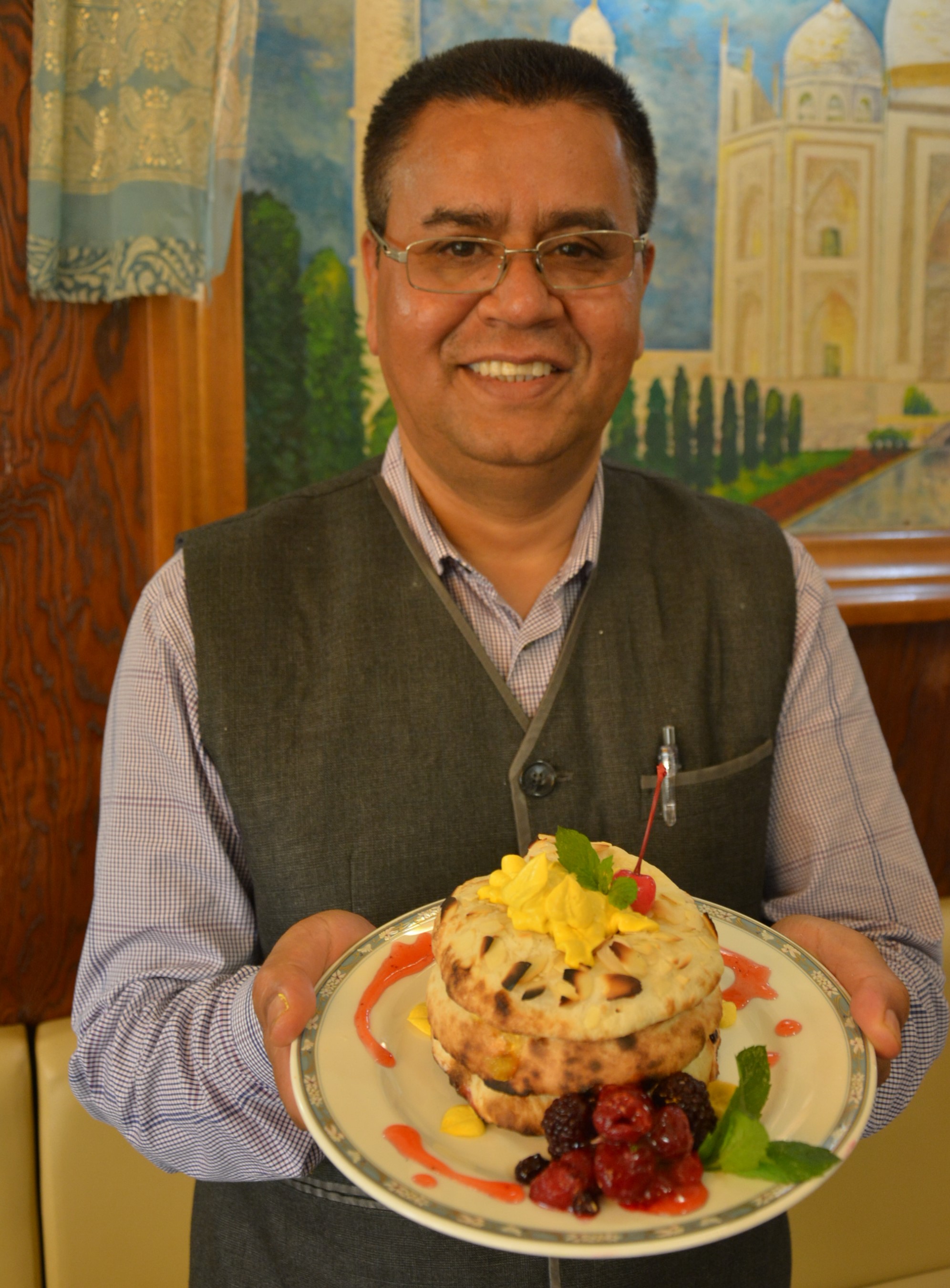 いまだ根強い人気を誇るパンケーキをインド人が作るとこうなりました。もちっとしたナンは巷にあふれたパンケーキのように軽々とナイフでは切れません。そのためお客様自身に専用のピザカッターで切って召し上がっていただきます。三層のナンの間にはソフトクリームやマーマレードジャムを挟み、まわりには季節のフルーツを色鮮やかに添え、上にはターメリックソフトクリームを盛りつけました。最後にハニーシロップをかけて完成です。ラッシーやチャイなどお好きなドリンクと合わせてどうぞ。※なくなり次第終了