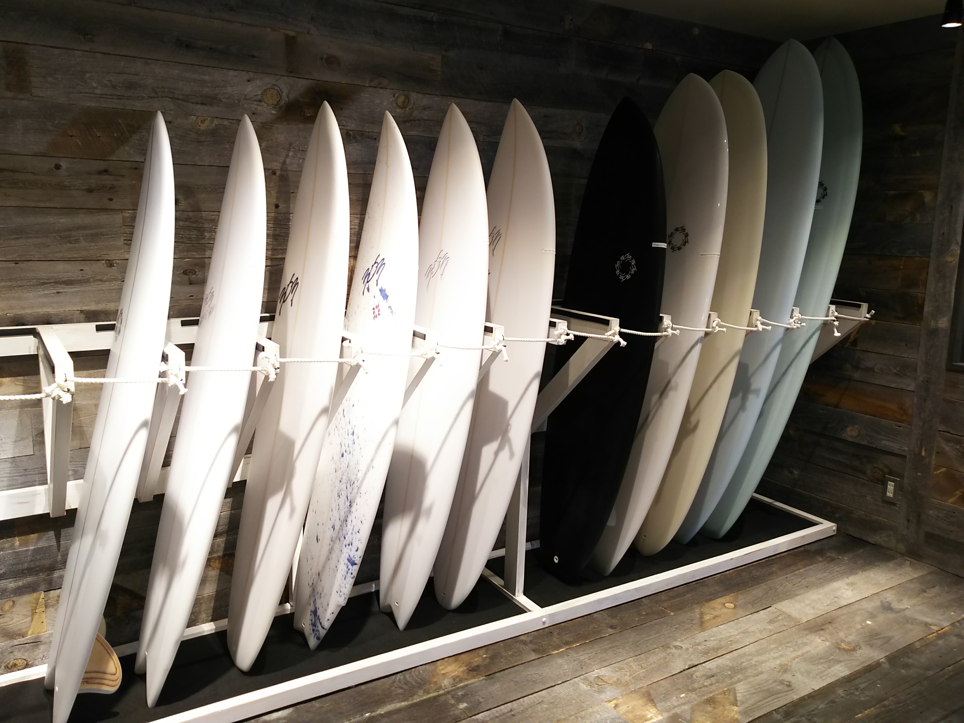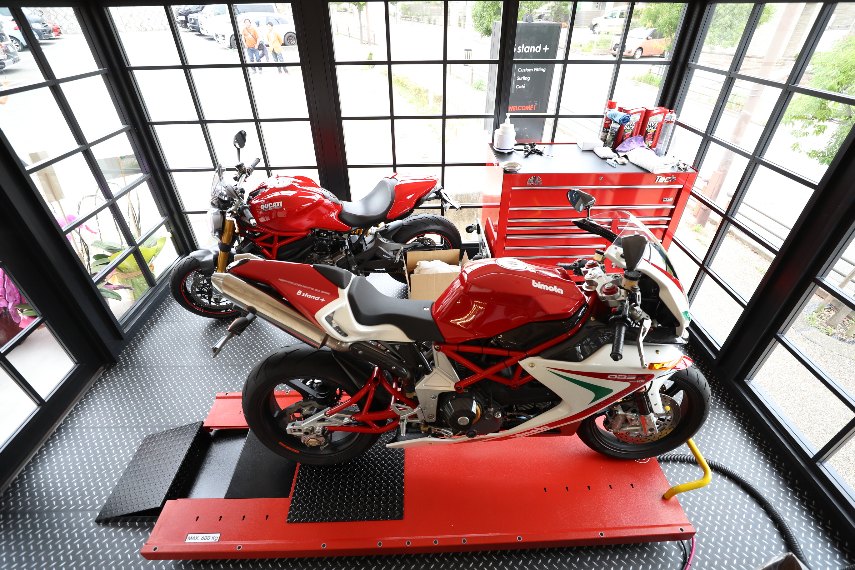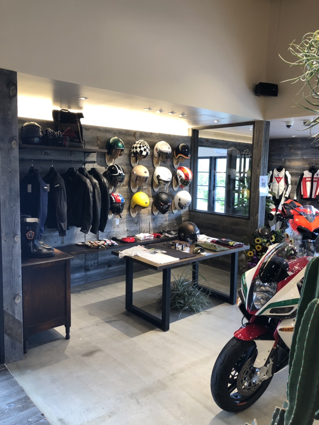 木と白が基調の、スタイリッシュで落ち着いた店内は、「バイクエリア」「サーフエリア」「カフェエリア」の3つで構成。「サステイナビリティ」をテーマとし、「バイクエリア」には「DUCATI」「bimota」など、量販店では購入できない高性能で高品質なバイクを取り揃え、経験豊富な職人による整備やカスタム、中古バイクの委託販売にも力を入れます。「サーフエリア」は職人によるオーダーメイドのサーフボードや、カスタム用のパーツ、ウェットスーツなどを取り揃え、バイク、サーフ共に「いいものを長く大切に利用できる」ことにこだわりました。