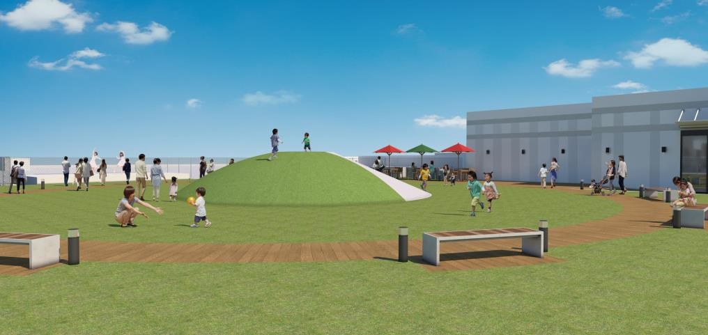 屋上には、一面天然芝生を敷いた「芝生ひろば」を設置し、中央には子どもの遊び場として、滑り台を配置します。また、屋外ステージを整備し、さまざまなイベントを開催します。地域の皆さまの憩いの場として、新たなにぎわいを創出します。