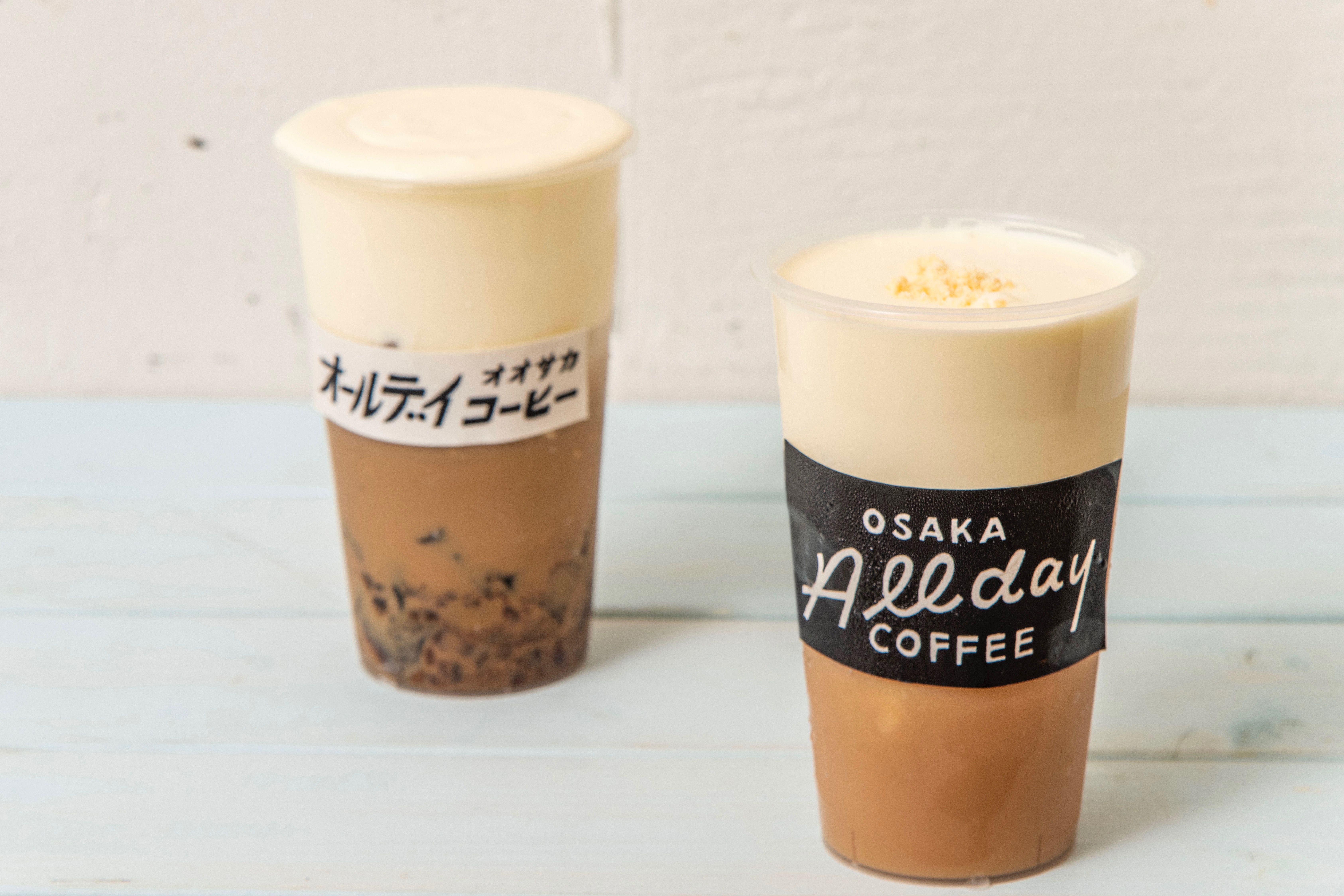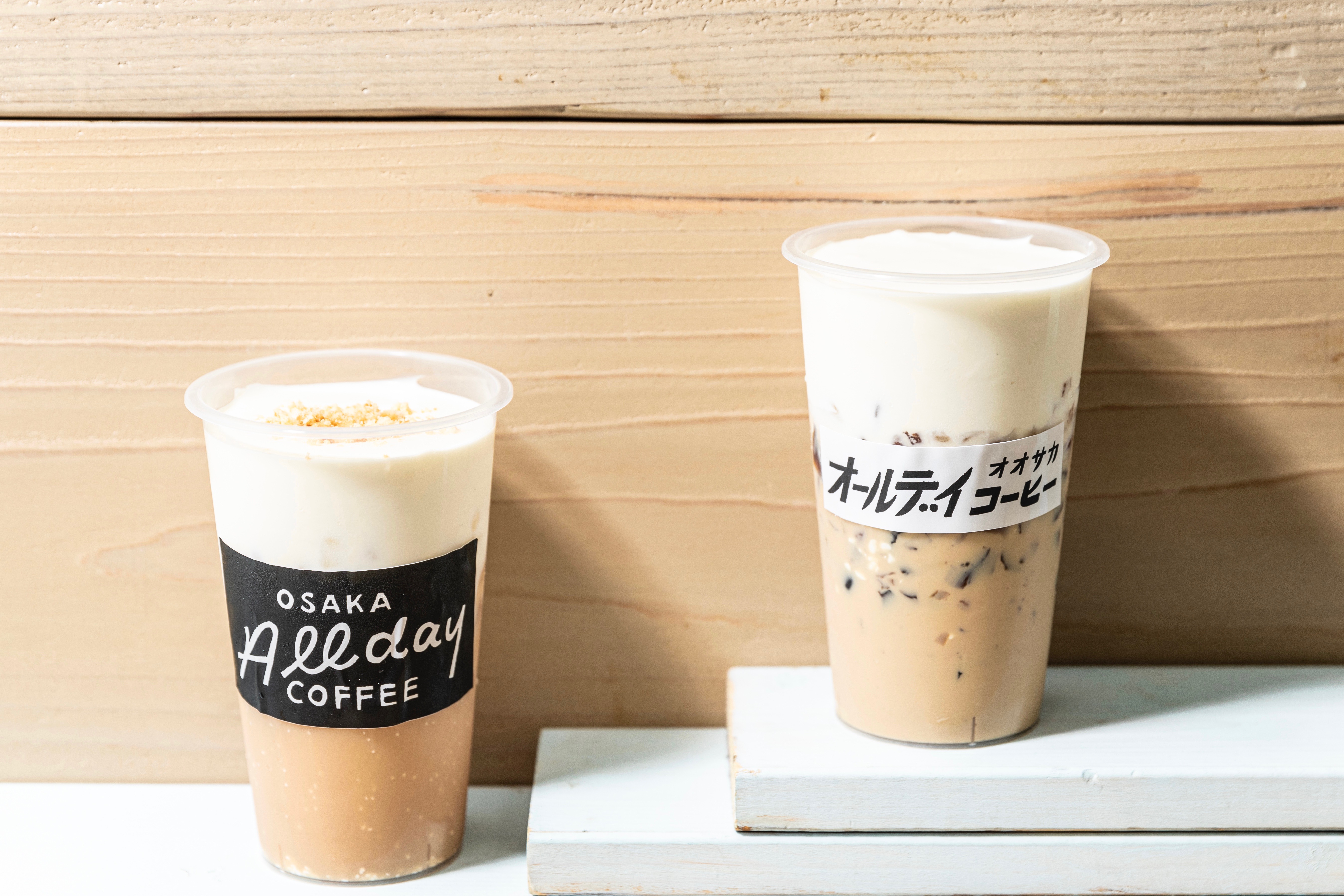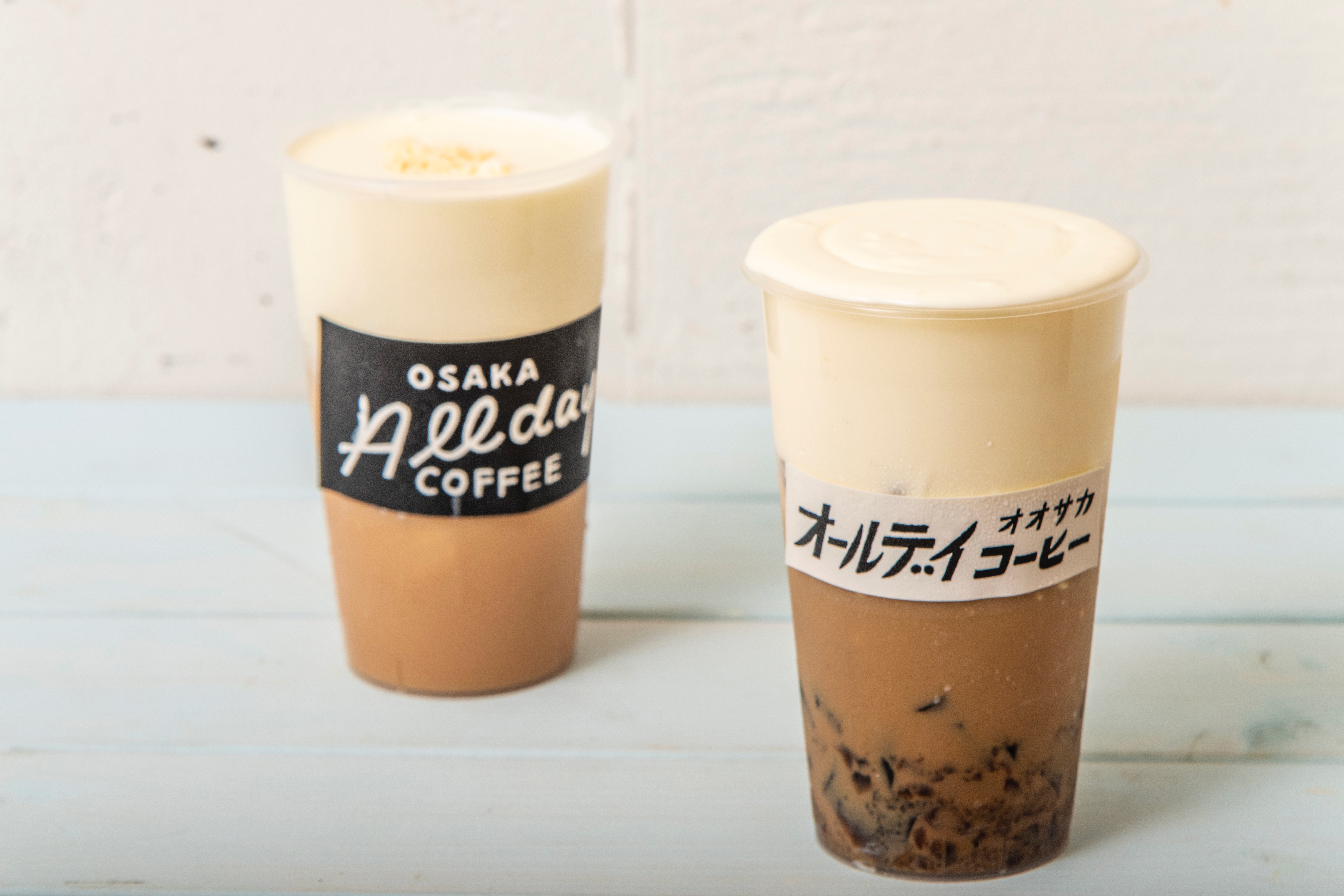 ALL DAY COFFEEオリジナルのミルクコーヒーにダークブレンドのコーヒーを使ったほろ苦い自家製コーヒーゼリーを入れ、ソルティなチーズクリームをトッピングしました。