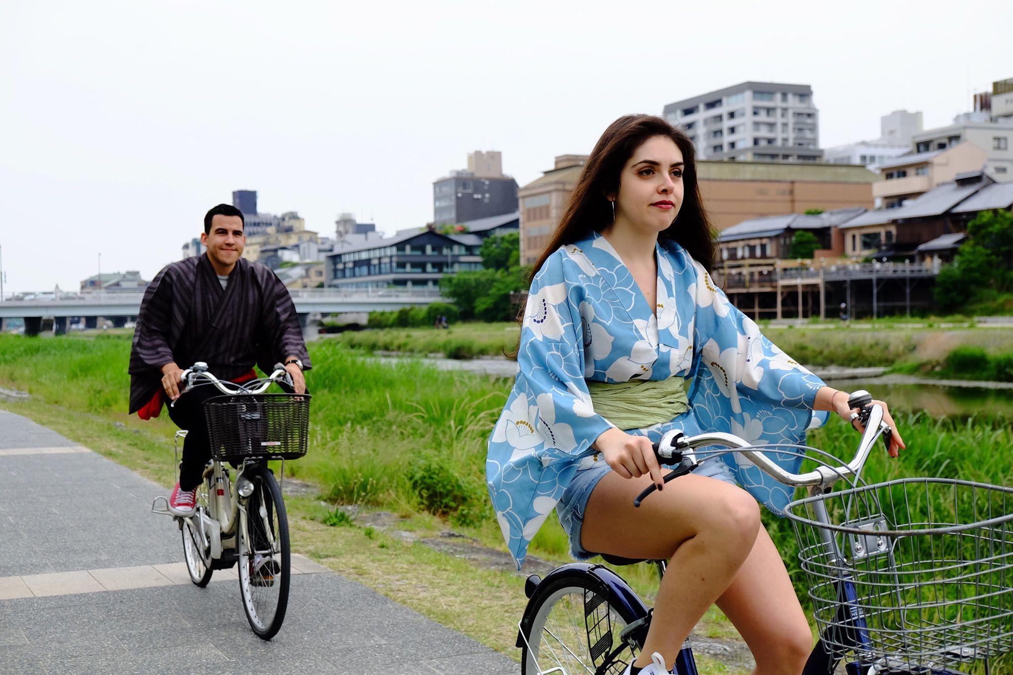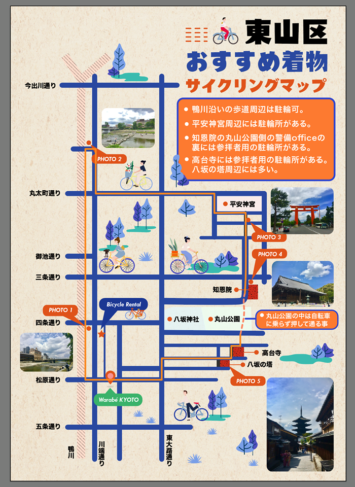女性用は二部式の上部のみ、男性ものは特別に下部分をカットして上着だけにした浴衣又は着物を貸し出します。当社の浴衣は東レのセオアルファという国産の特別な素材を活用しており、空気の透過性が高い事によりとても涼しく快適です。風が入るとさらに体感として涼しく、日焼け防止にもなります。サイクリング時には、フォトジェニックなスポットを巡回できるマップを手渡し、一味違った京都観光を楽しめます。