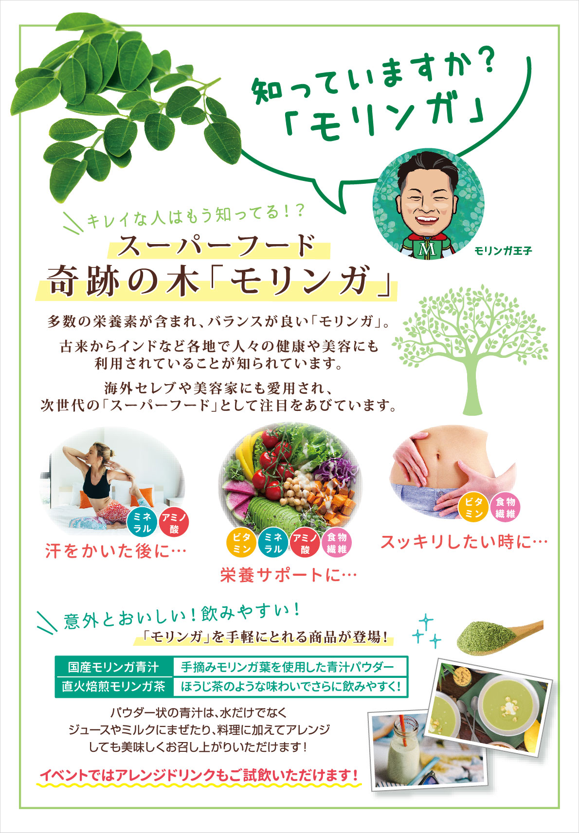 「国産モリンガ青汁」「直火焙煎モリンガ茶」を試飲出来ます。