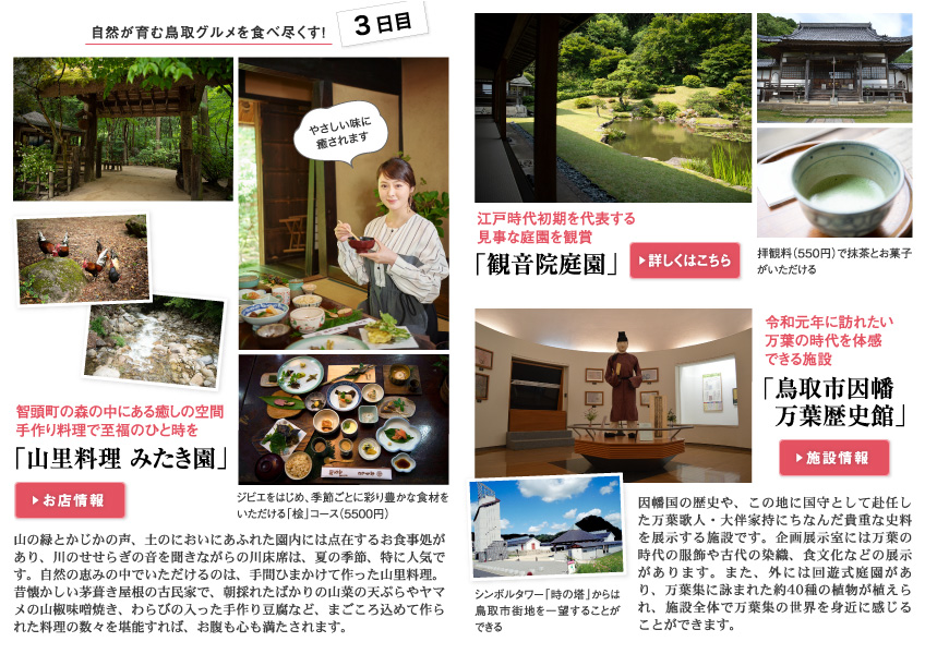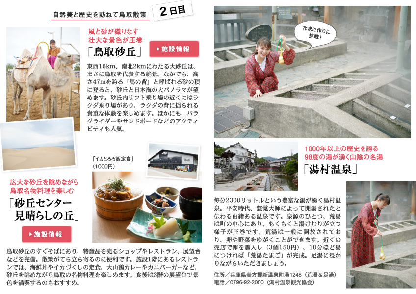日本最大級の「鳥取砂丘」をはじめ、美しく迫力のある絶景が広がる「浦富海岸」、山間で滋味深い里山料理をいただける「みたき園」、「若桜鉄道」に乗って楽しむのどかな鉄道の旅など、各地に見どころがあふれる麒麟のまち。自然が織りなす絶景とグルメを堪能する2泊3日の旅に貫地谷しほりさんがでかけます。新元号「令和」の出典元として話題になった「万葉集」について学ぶことができる「鳥取市因幡万葉歴史館」もぜひ今年訪れておきたいスポット。「景色、食べ物、人、すべてに癒されました」と貫地谷さんもすっかり満喫した様子でした。