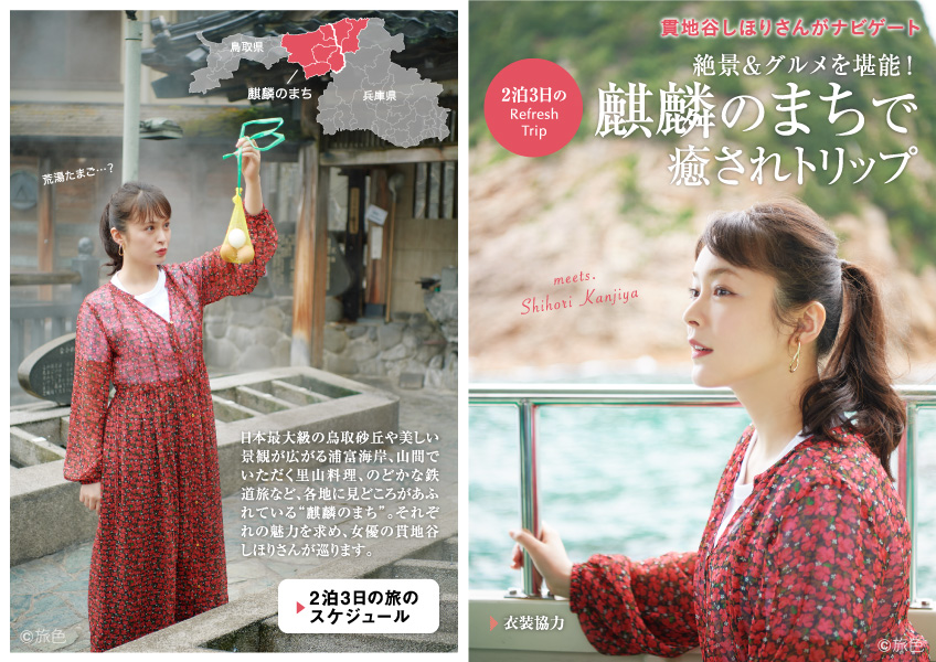 電子雑誌「旅色」は、一般社団法人麒麟のまち観光局(https://www.kirinnomachi.jp/org/)と提携し、鳥取県鳥取市、岩美町、若桜町、智頭町、八頭町、兵庫県新温泉町、香美町の旅を特集する別冊を公開しました。同観光局は、日本遺産にも認定された伝統芸能「麒麟獅子舞」が受け継がれている鳥取県・兵庫県をまたぐ1市6町が「麒麟のまち」として、観光や移住・定住など様々な分野で連携し、魅力あるまちづくりに取り組んでいます。今回は、豊かな自然や文化、歴史に彩られた麒麟のまちの絶景や恵まれた山海の幸など、さまざまな魅力を女優の貫地谷しほりさんが誌面と動画でたっぷりとナビゲートします。