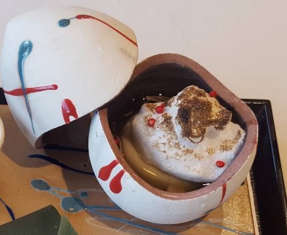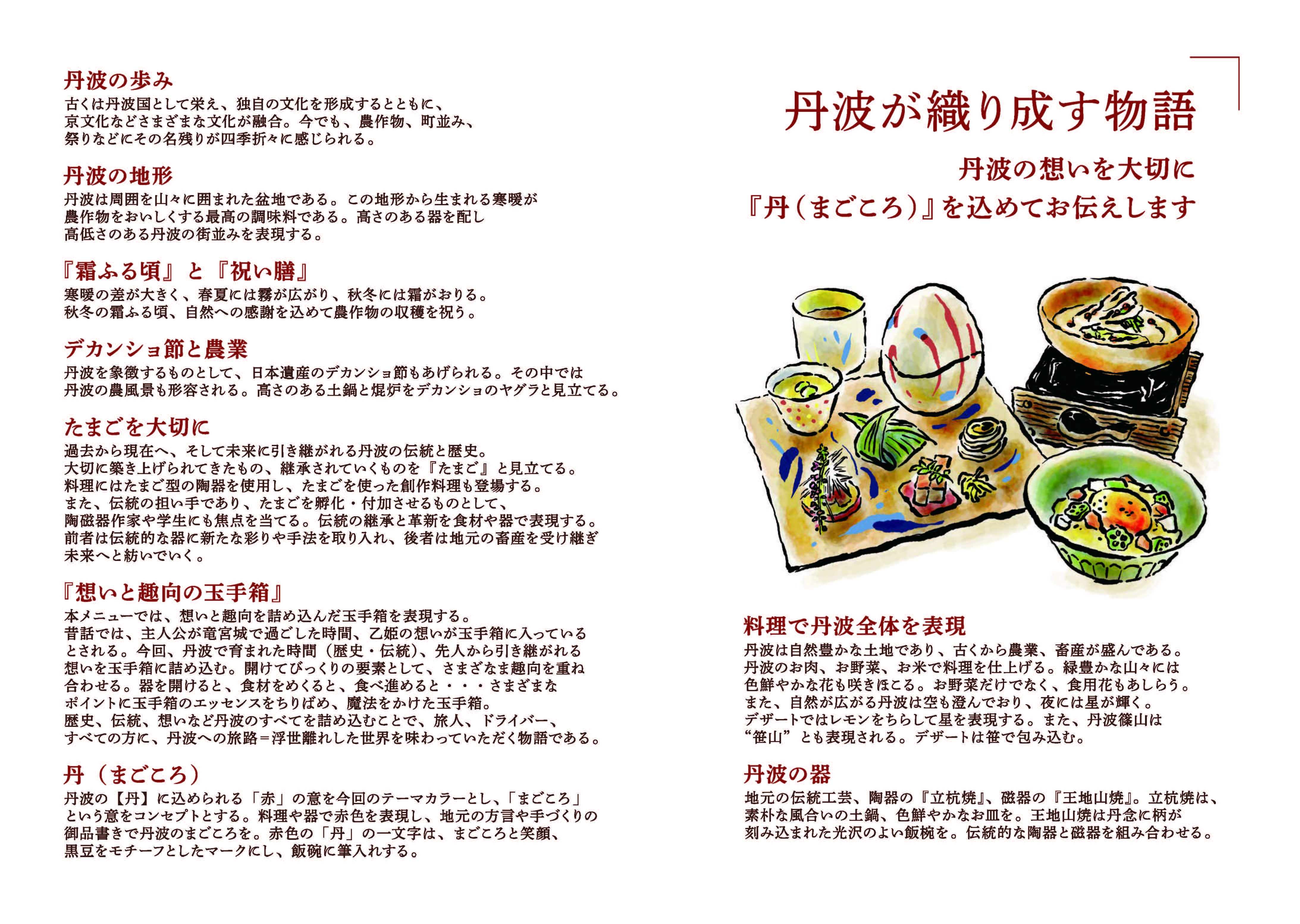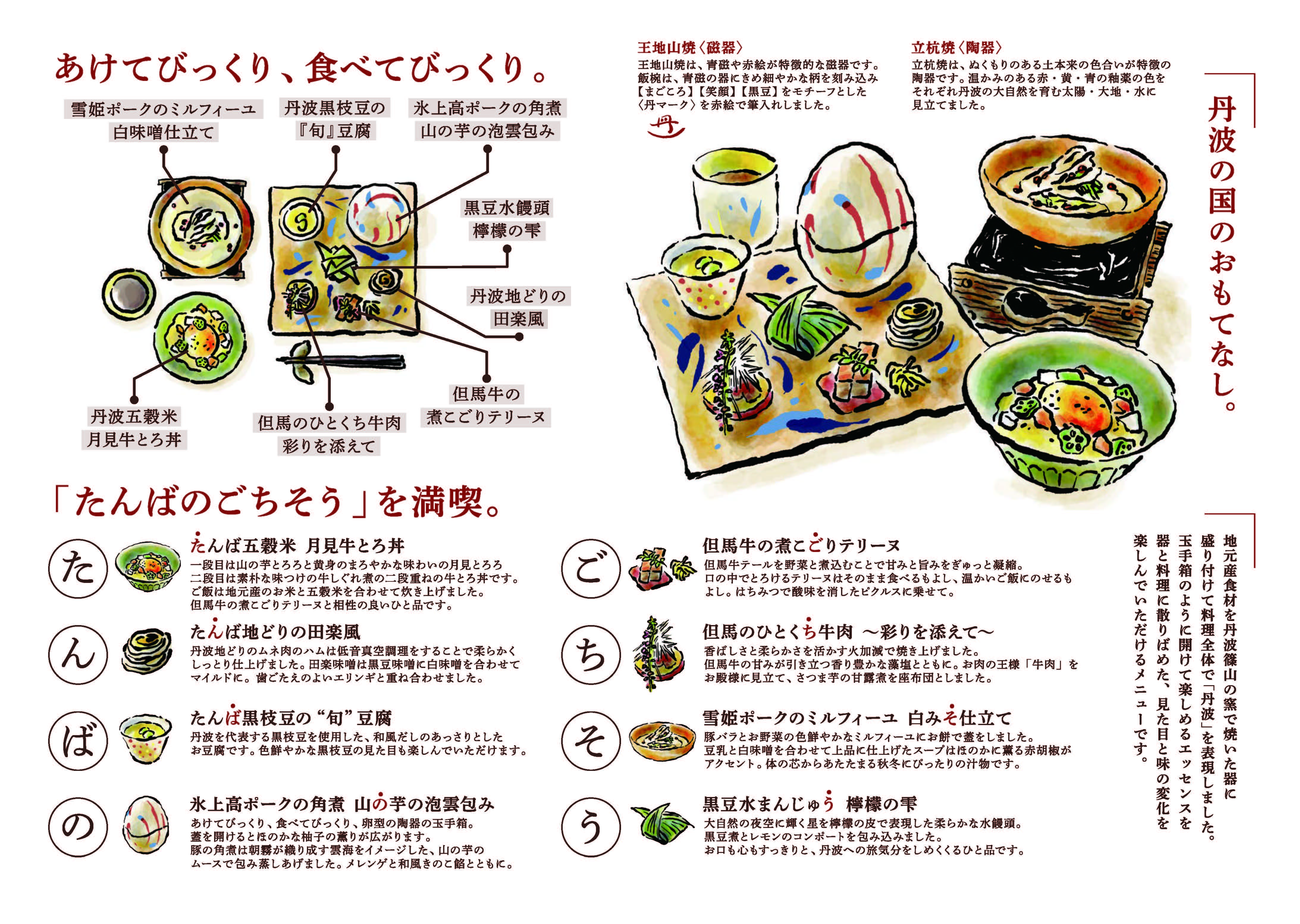 食材は地元で評価の高い但馬牛、氷上高ポーク、丹波地どりなどのお肉をはじめ、山の芋や黒豆といった野菜、お米も丹波にこだわりました。器には、地元の伝統工芸である「丹波立杭焼」の陶器と「王地山焼」の磁器を組み合わせております。また、「開けてびっくり、食べてびっくり」の玉手箱をめざし、器だけでなく料理にもさまざまな趣向を重ね合わせました。