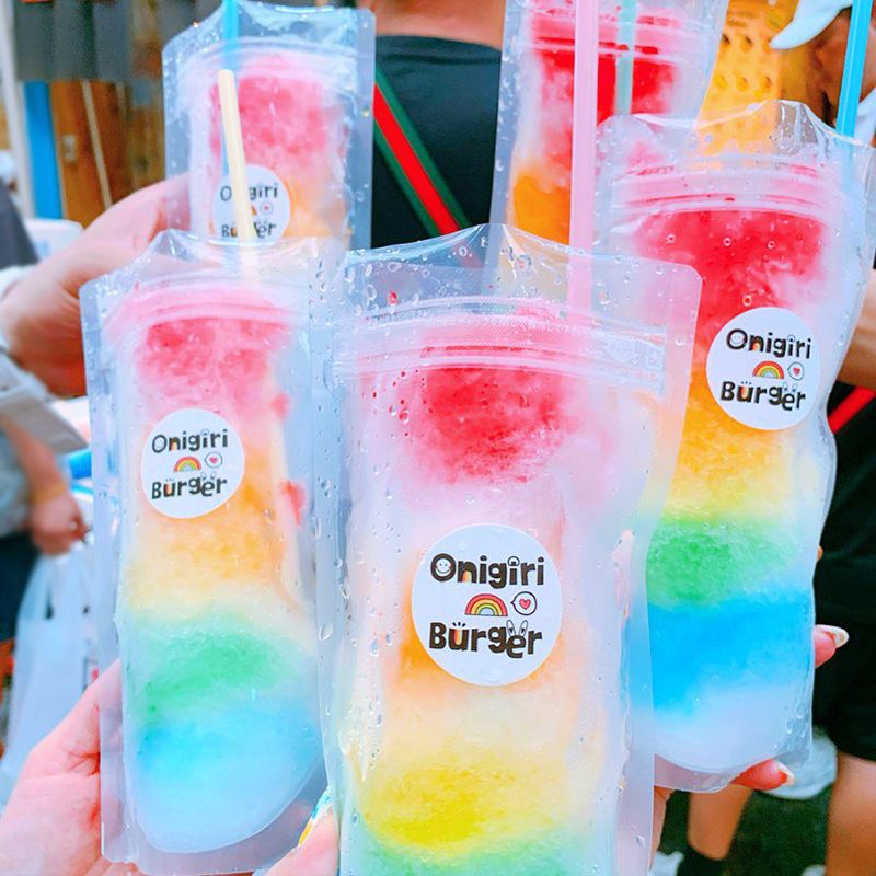 「おにぎりバーガー」のロゴにもある”虹”をイメージした、ブルーハワイ、メロン、みぞれ、レモン、マンゴー、白桃、苺の7色の風味のシロップがかけられ、色鮮やかで、まさに“インスタ映え”なかき氷。流行りのドリンクポーチに入れて、インスタ映えをを詰め込んだ「レインボーシェイブアイス」を完成させました。天然氷で作られた、きめ細やかでジューシーな味わいが口いっぱいに広がります。