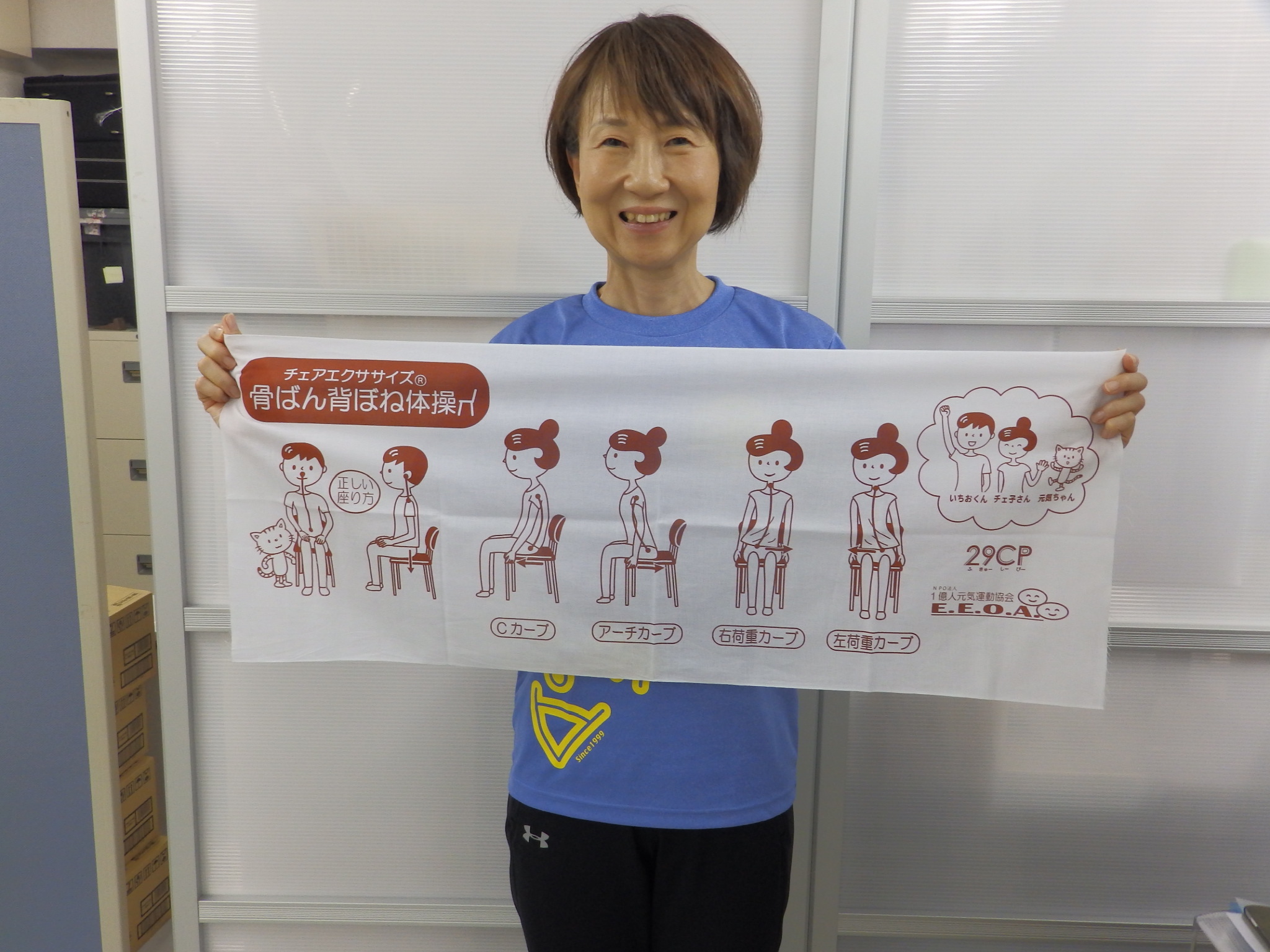 また、椅子座位の時間が多い高齢者にお勧めの姿勢改善体操「チェアエクササイズ®骨ばん背ぼね体操」のイラストがプリントされた手ぬぐいを販売し、さらなるファシリテーターの育成にあてるプロジェクトも同時にスタート。クラウドファンディングも準備中です。