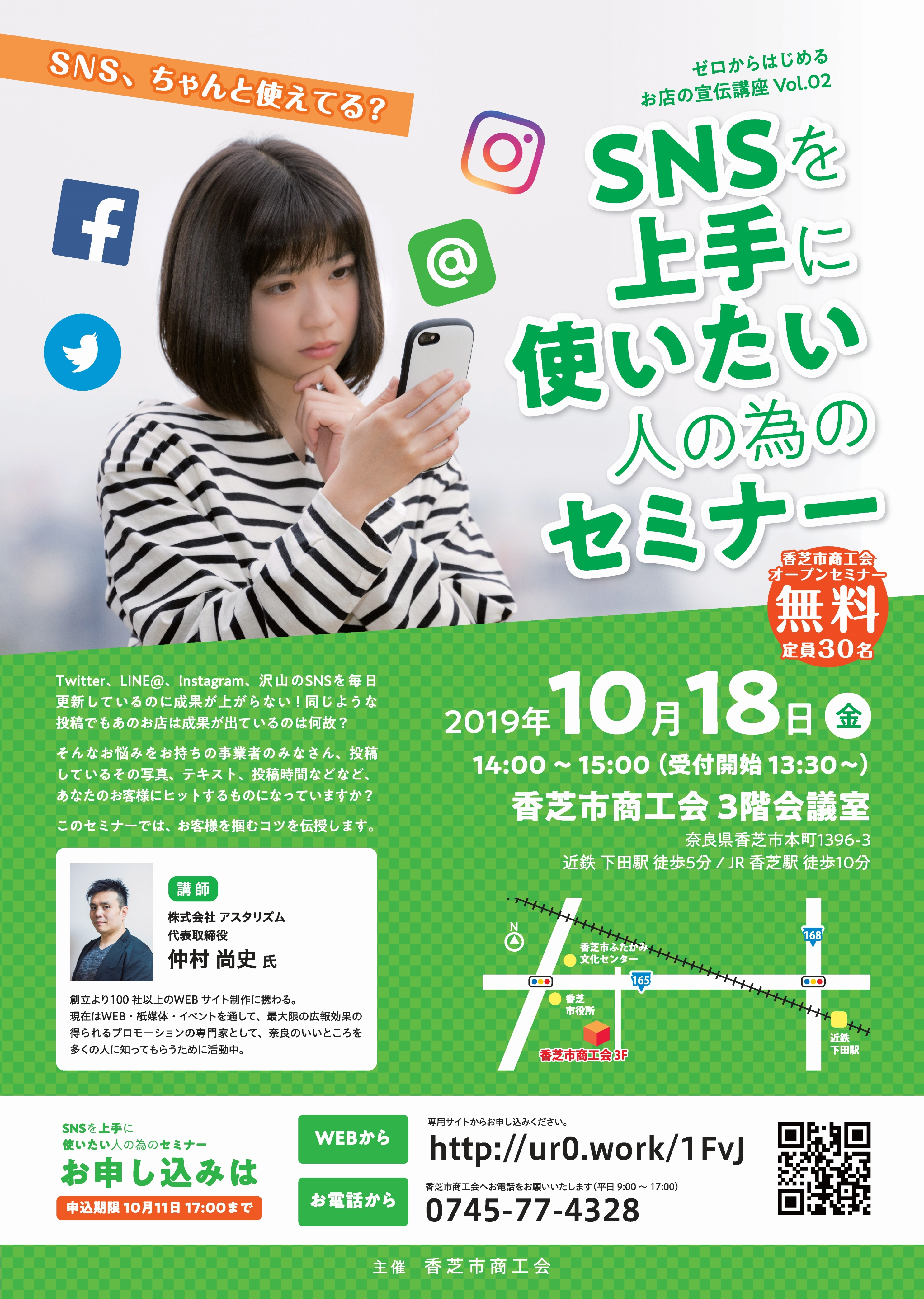 香芝市商工会は株式会社アスタリズム 仲村尚史氏を講師に迎え、「SNSを上手に使いたい人の為のセミナー」を開講することをご報告いたします。