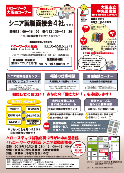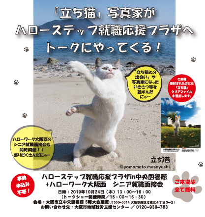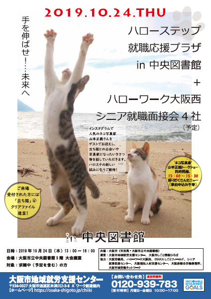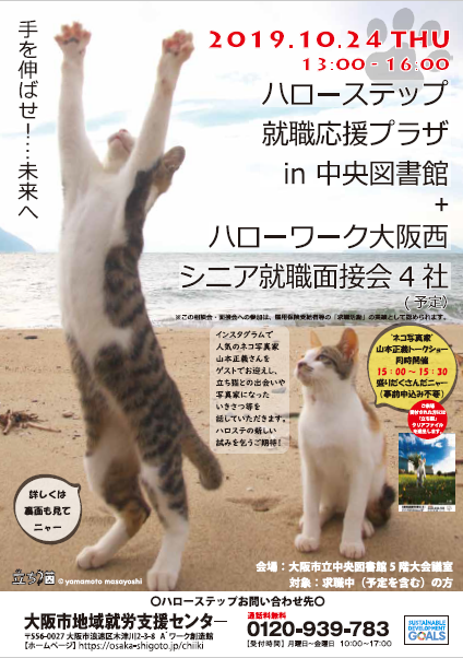 大阪市があなたの「働きたい」を応援します。その場で応募して面接を受けられるシニア面接会と、しごとに関わる色々な相談ができる、ハローステップ就職応援プラザがコラボして就職をバックアップするイベントです。今回は大阪市中央図書館にて、猫写真家をお招きしてトークショーも同時開催します。