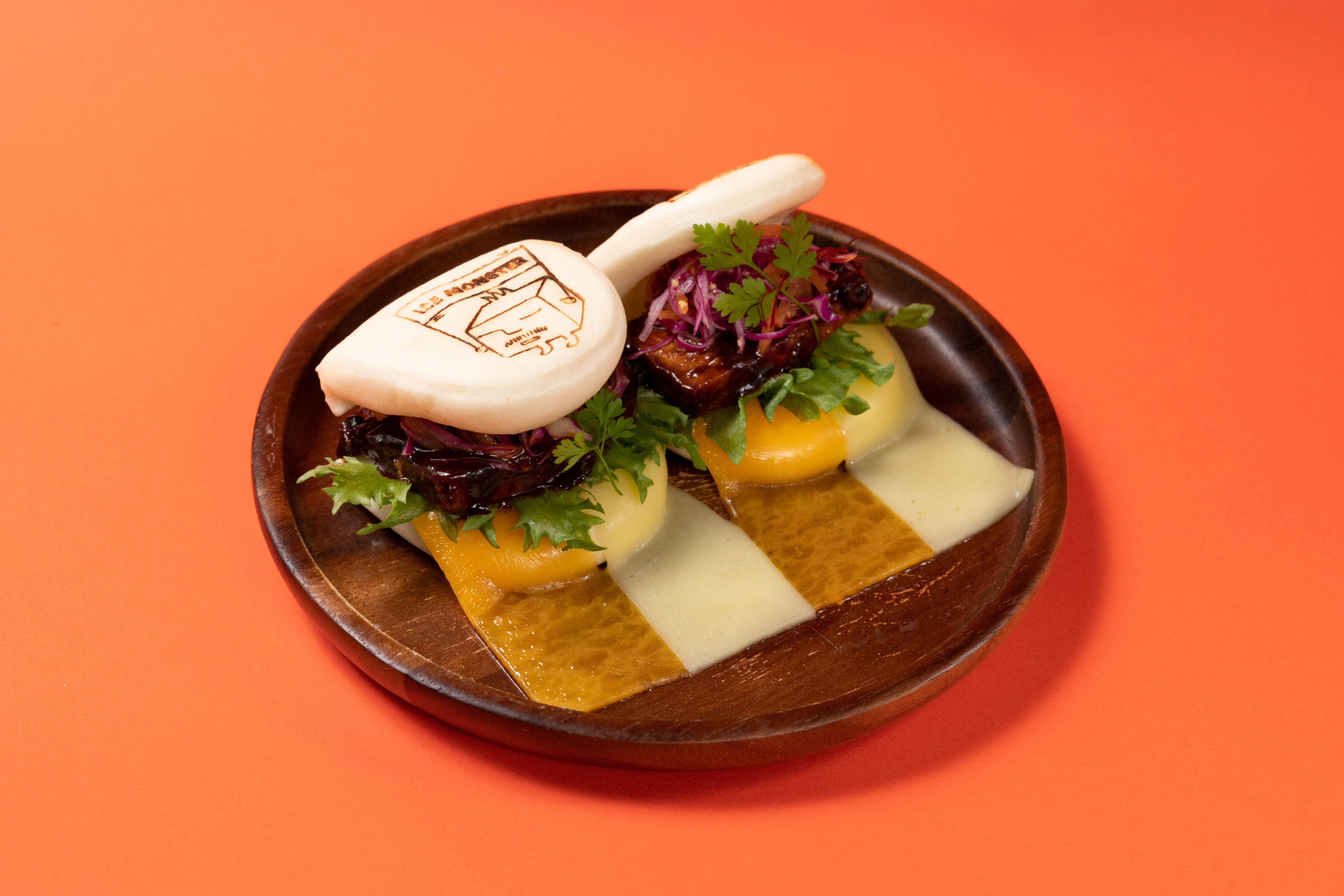 ICE MONSTERのメインキャラクター「アイスキューブマン」の焼印ふわふわ中華まんに、甘辛い台湾風豚の角煮「控肉(クワァンロー)」とキャロットラペ、紫キャベツ、フリルレタス、チャービルをはさみ、更にゴーダチーズとチェダーの2種のチーズがとろっとろにとろけ出したオリジナルBAO。