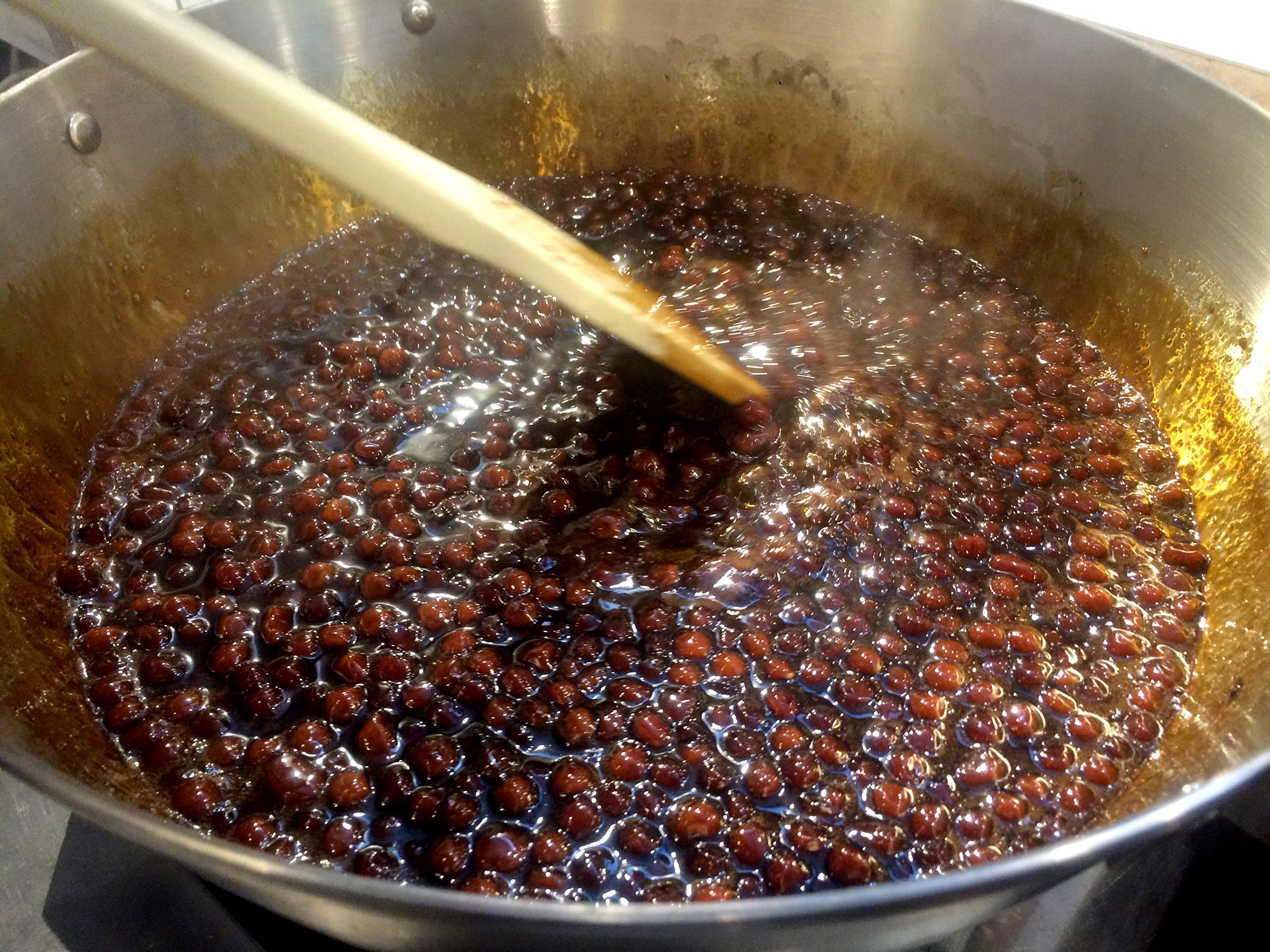 ■煮る 煎った黒糖にタピオカを加えモチモチになるまでじっくり煮込んでいます。