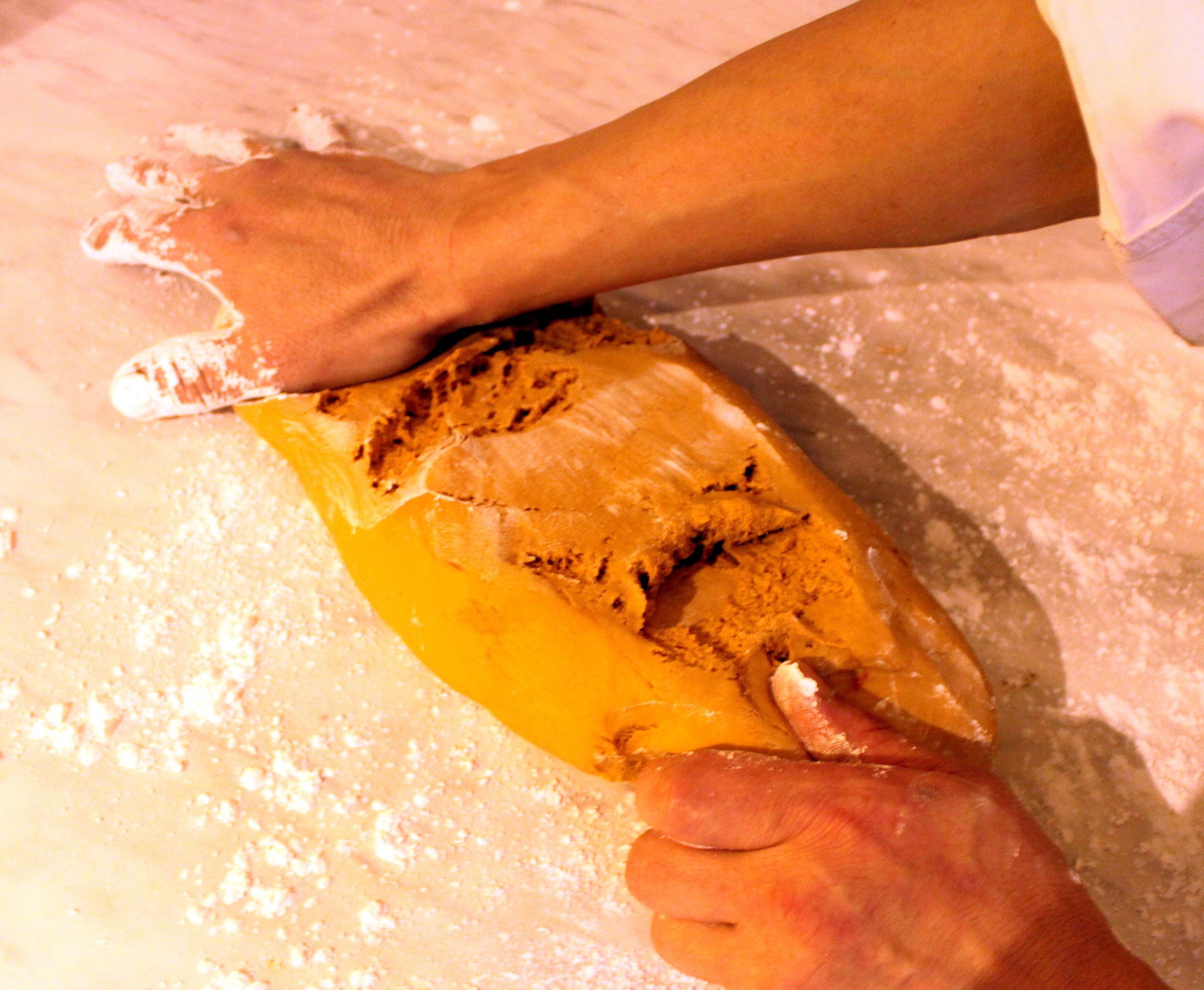 ■練る 台湾から輸入した独自ブレンドの粉に黒糖を練りこみ丹精込めてタピオカを作っています。