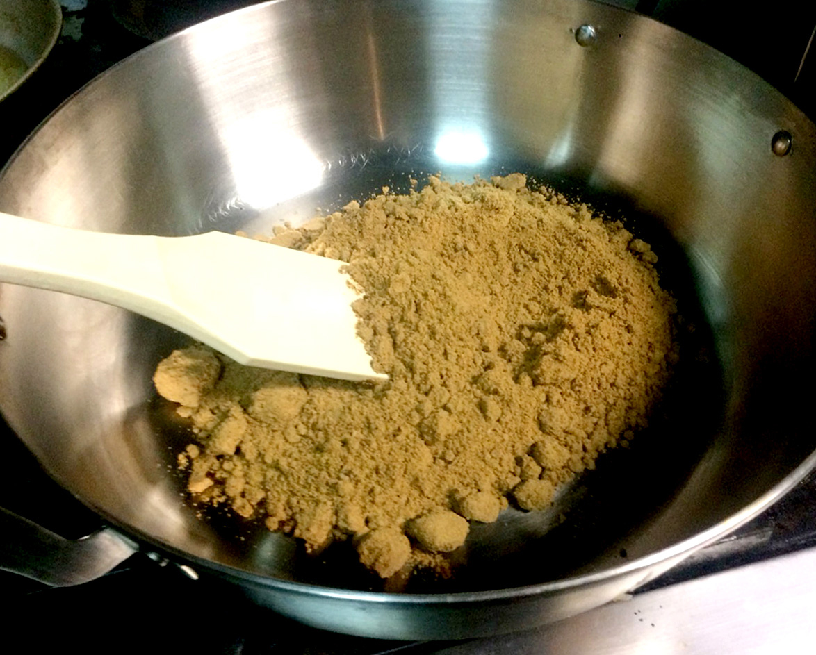 ■煎る 沖縄産黒糖を香ばしさを引き出すまで丁寧に煎っています。