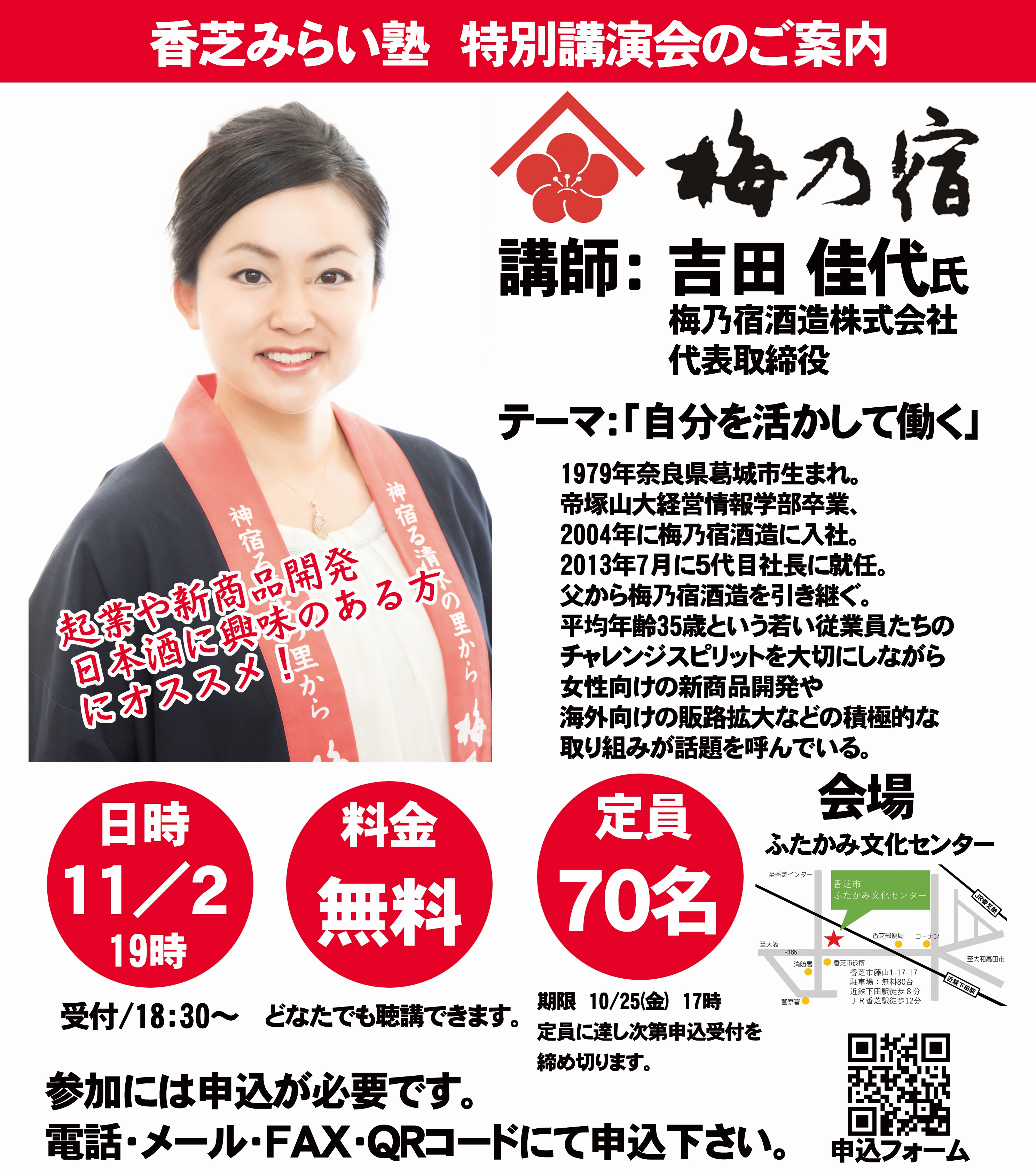 香芝市商工会は経済発展が見込める街・香芝市内で起業を目指す方へ向けた創業塾、「香芝みらい塾」にて先輩企業家による特別講演会を開催することを、ご報告いたします。