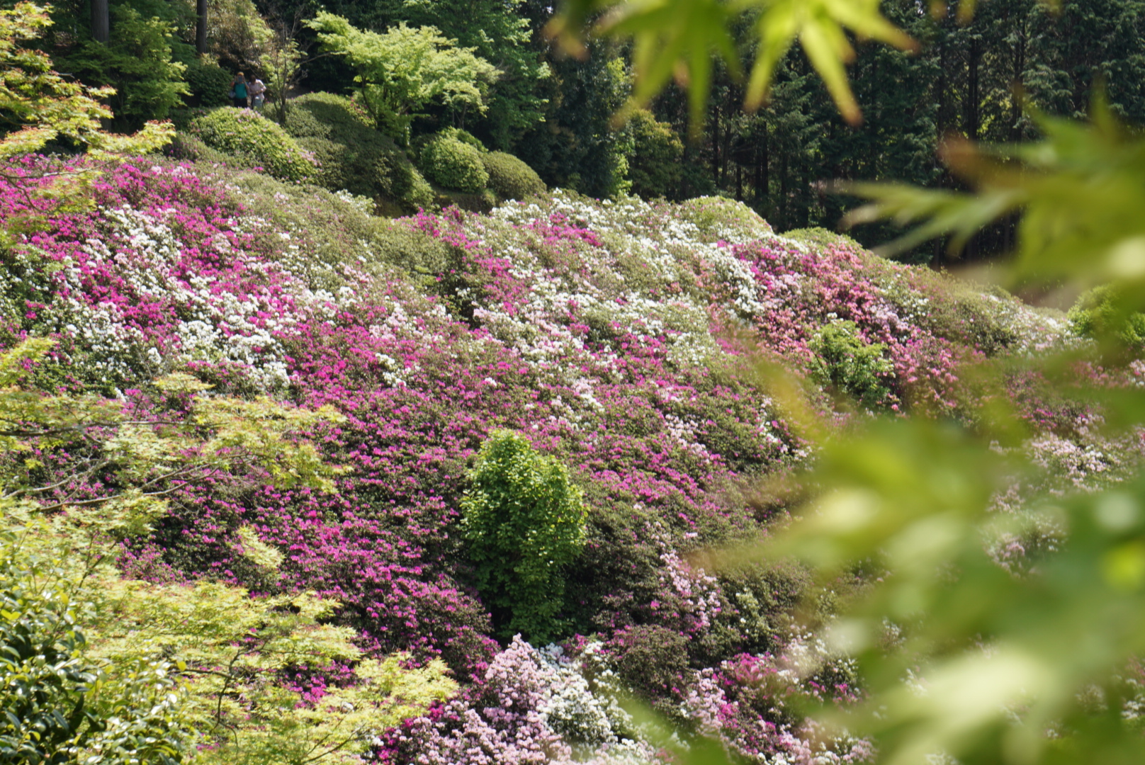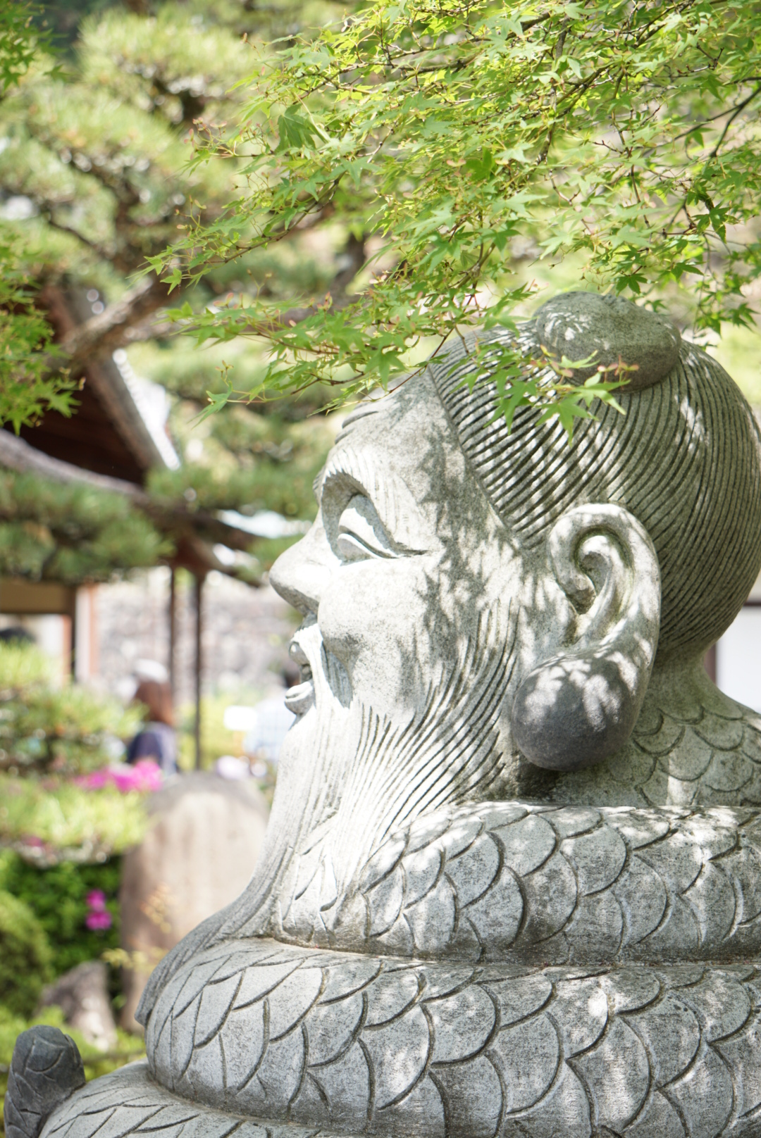 御本尊は秘仏の千手観世音菩薩。一般的な千手観音と異なり、三室戸寺の千手観音は腕が二臂(二本)と珍しい観音様です。また、境内には狛犬ならぬ狛牛や狛兎、狛蛇が安置され、そのユニークな姿が人気です。今秋11月9日~12月1日の土日祝は、9時から20分限りで、宝物館にて秋の特別拝観「観音様の足の裏を拝する会」が行われます(宝物館特別拝観料500円、開扉中の中途入館不可)。花の寺としても知られ、5月にはツツジ、6月にはアジサイが広大な境内をダイナミックに彩ります。また7月には本堂前のハスが次々と開花し、ハス酒を楽しむ会も開催されます。