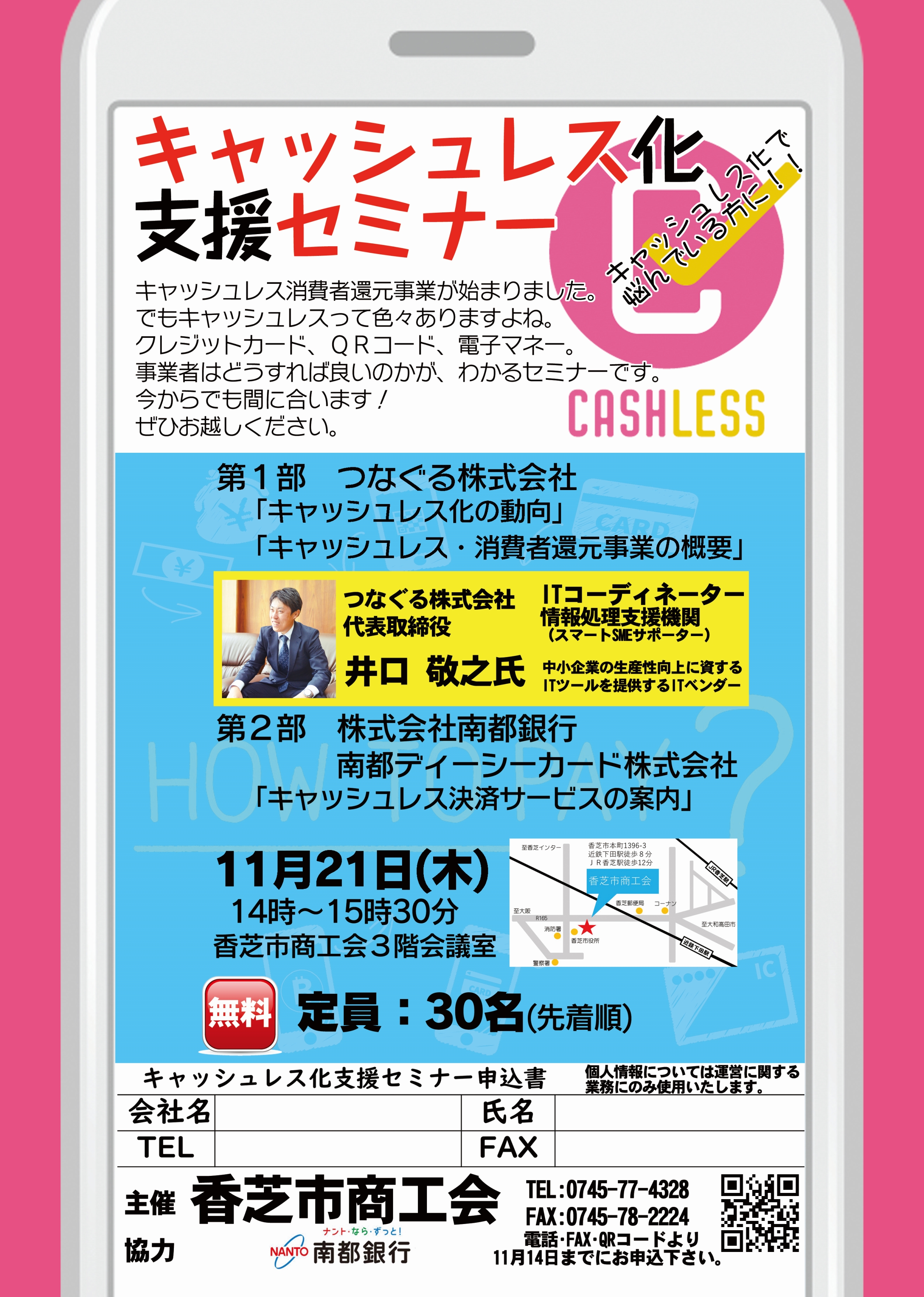 香芝市商工会は、つなぐる株式会社 井口敬之氏を講師に迎え、「キャッシュレス化支援セミナー」を開講することをご報告いたします。