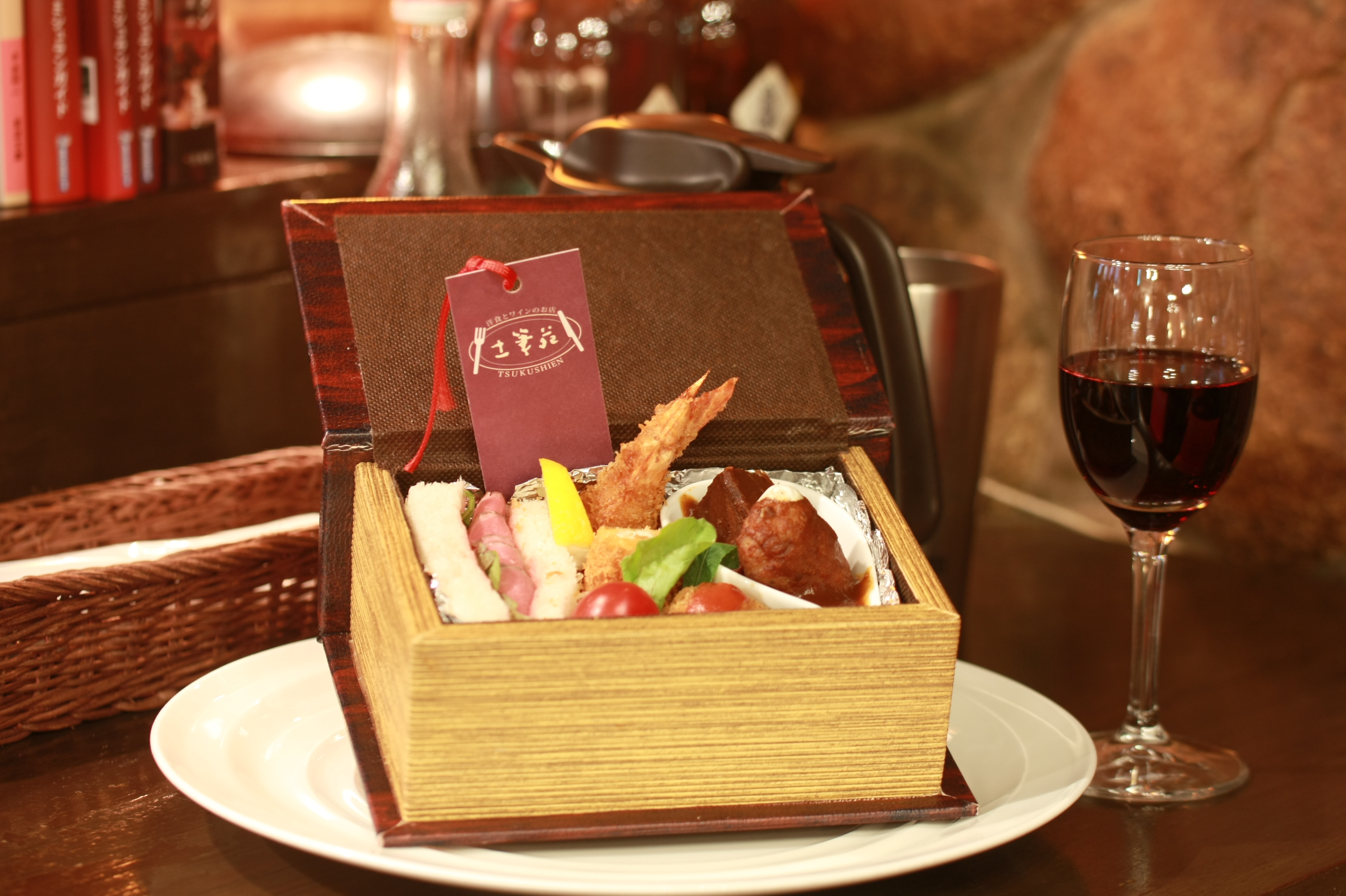 本と洋食をどちらも楽しめるように料理にもこだわりました。「読書洋食席」のお客様だけが注文できる特別メニュー「読書の洋食」(税別 929円)は、見た目がクラシック本そっくりの器にミニマムサイズのローストビーフサンド、エビフライ、タンシチュー、ハンバーグ、カニクリーミーコロッケを詰め込んだ特製洋食ボックスで、箱ごと平皿に載せてご提供します。席利用者には、読む本のジャンルやタイトルにあわせて当店のソムリエ・名田匡輔がインスピレーションで選ぶ「読前酒」を1杯無料でサービスします。