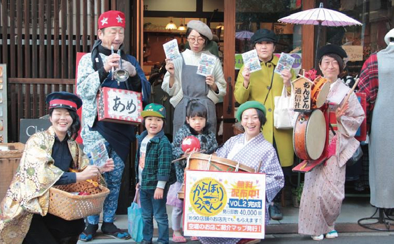 空堀では個人店が多く、路地の入り組んだ中にあるお店も多い為、空堀の町を歩くのにマップは必須のツールと考えています。マップ「からほりらへん」は、空堀に住んでいる人(パパ、ママ、働く人など)、住んでいないけど空堀が好きな人、からほりらへんのお店の店主など総勢15人で作っています。