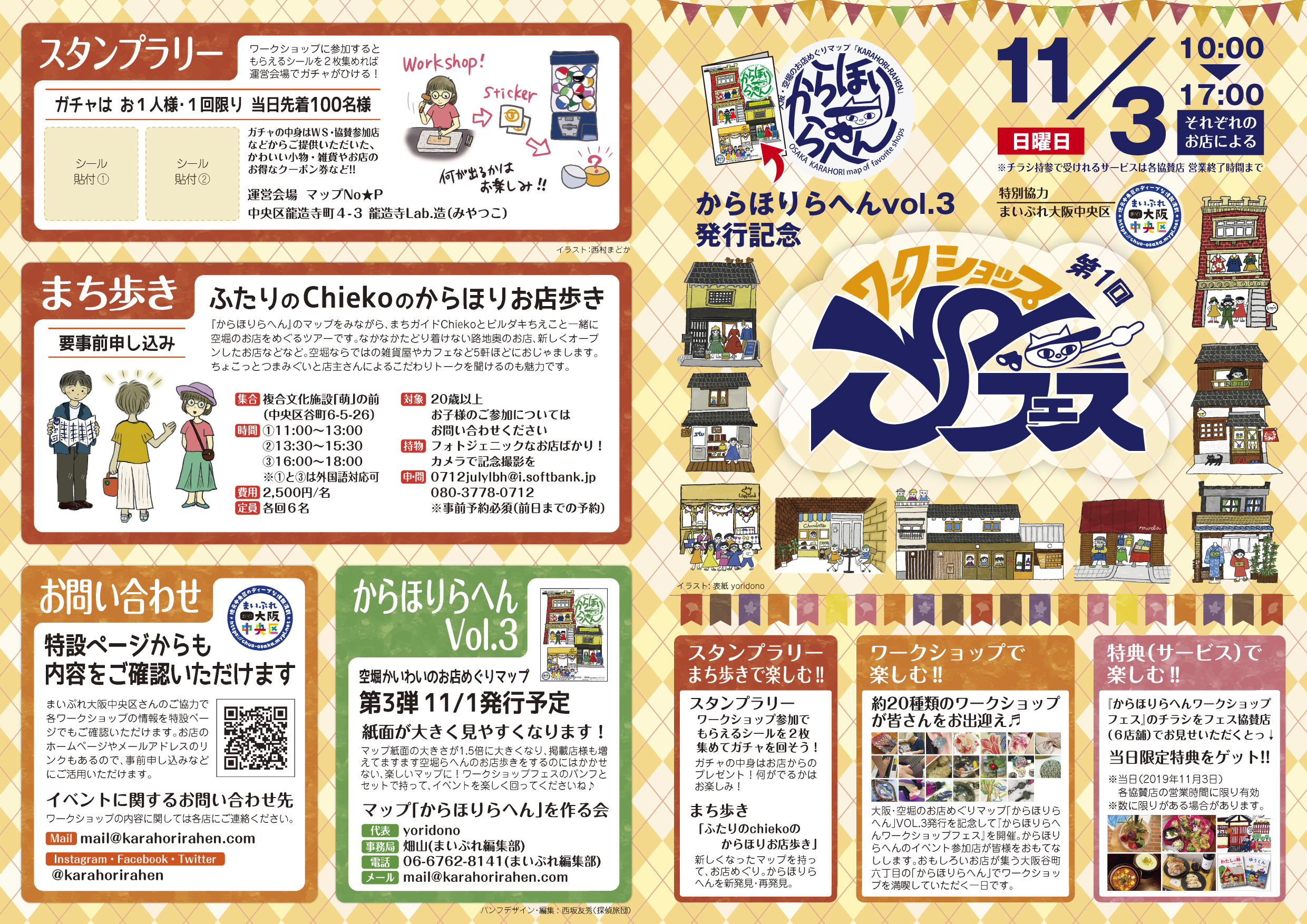 マップからほりらへんを作る会(本部:大阪市中央区谷町六丁目、メンバー:空堀を愛する15 名、以下 作る会) は、2019 年11 月1 日、空堀のお店めぐりマップ『からほりらへん』第3号をリリースします。