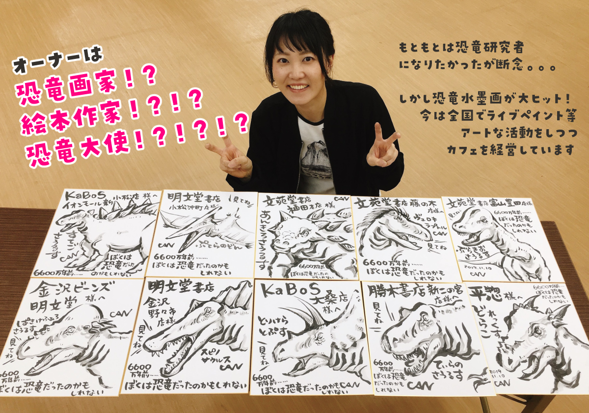 初めまして!創作空間caféアトリエのオーナー安田佳那子と申します。現在は創作空間caféアトリエ本町店の店長兼恐竜画家CANとしてクリエイティブな活動をしています。最近徳島県の恐竜大使第1号にも認定されました!2019年10月には自身初の絵本も出版され、クリエイターを率いる経験を積んでいます。