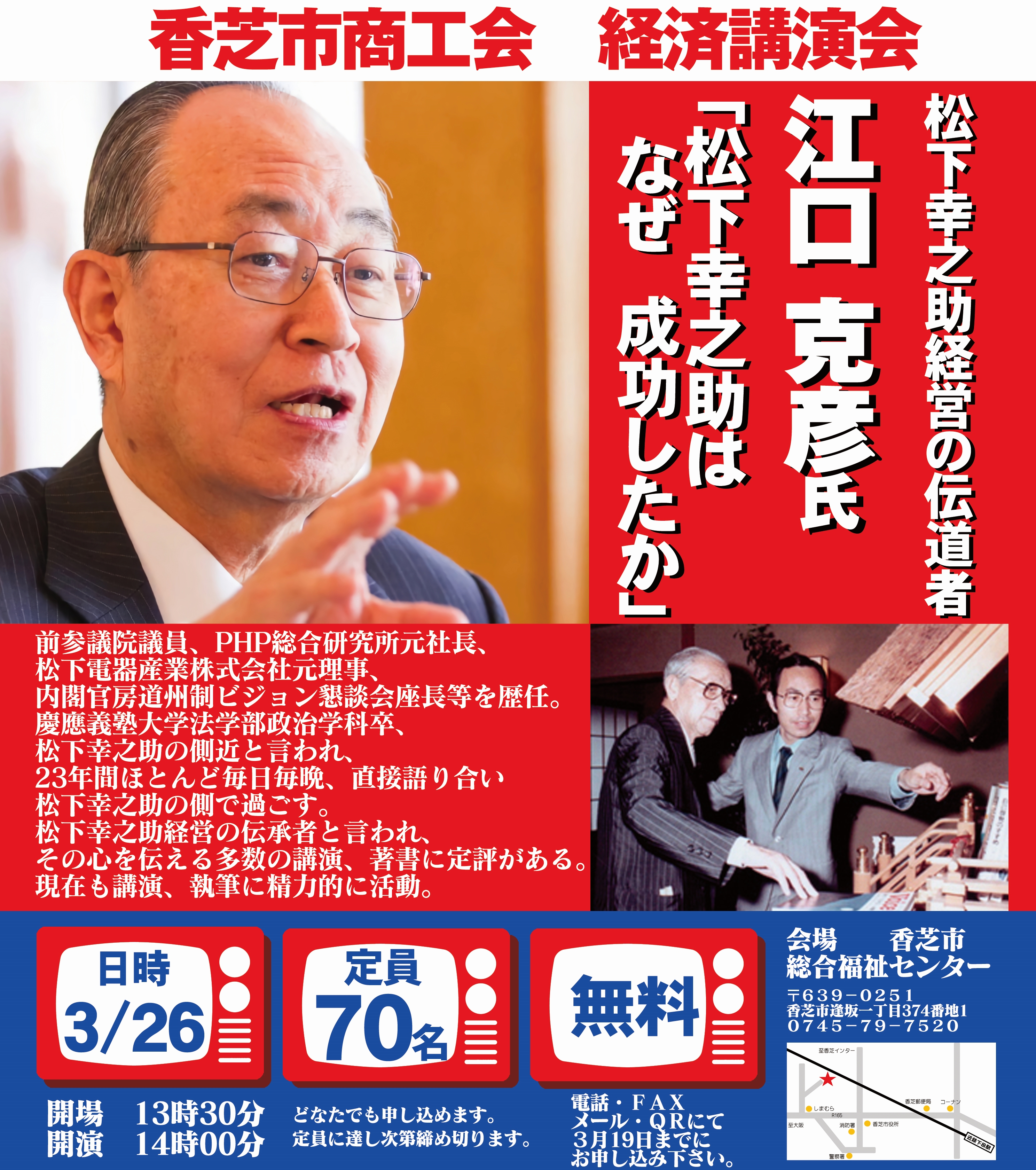 香芝市商工会は、松下幸之助経営の伝道者 江口克彦氏を講師に迎え、経済講演会を2020年3月26日(木)に開催することをご報告いたします。
