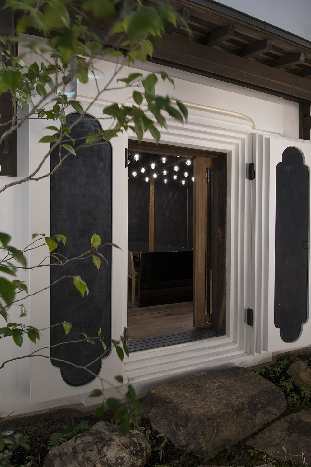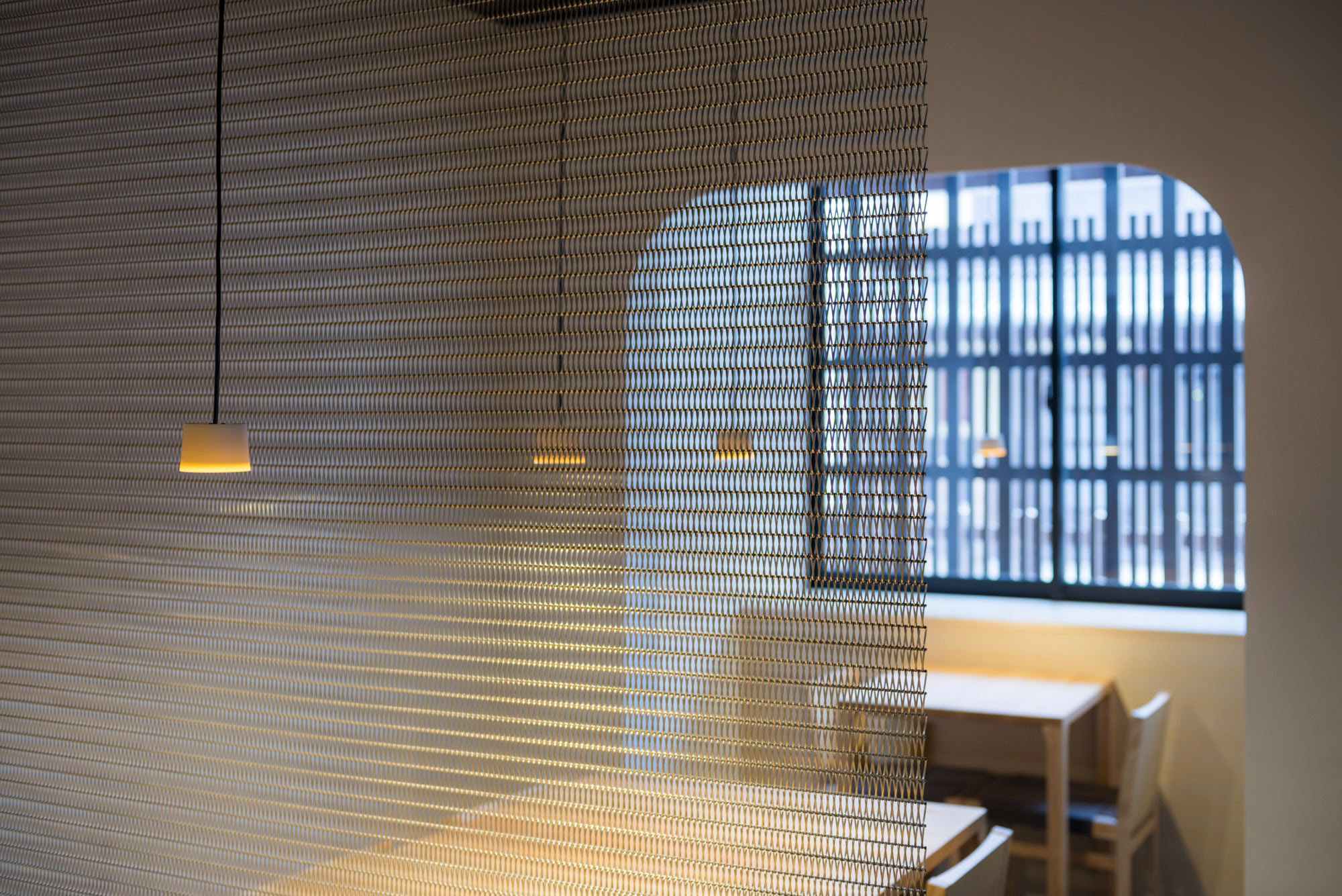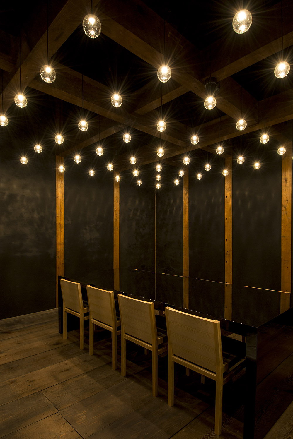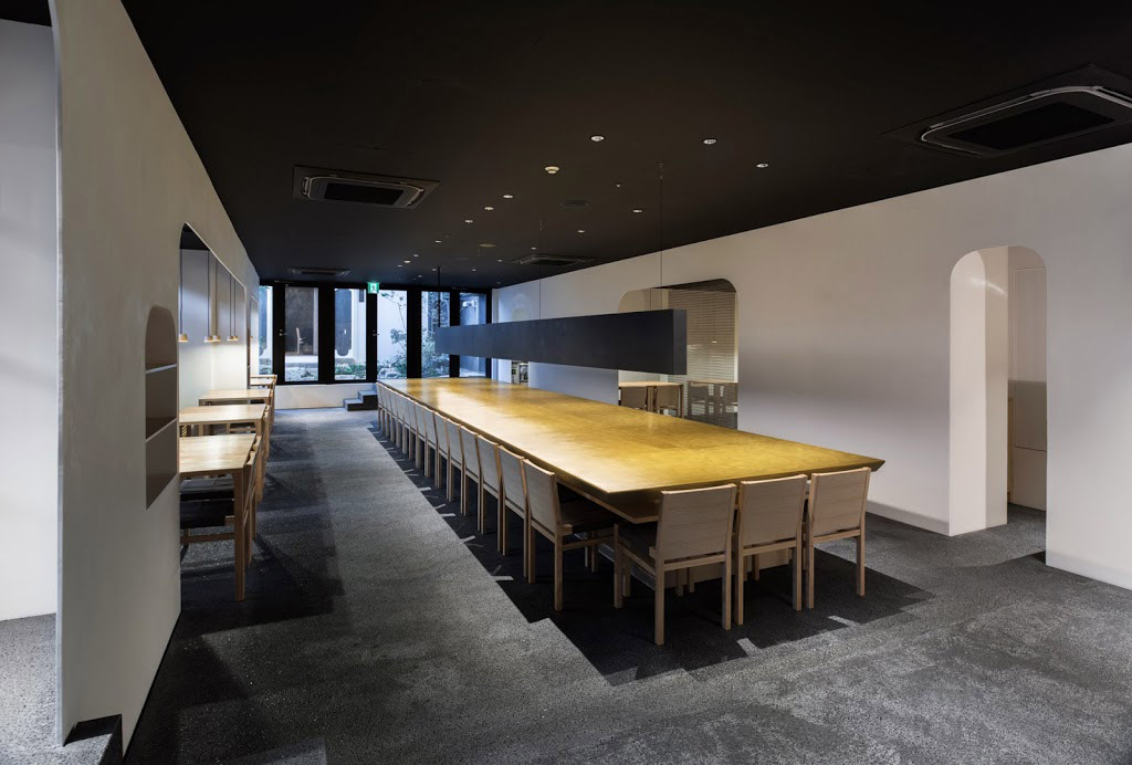 暖簾をくぐると建築家、永山祐子が手がけた和モダンの世界が広がります。薄い漆喰の白い壁、ろうそくのような幻想的な光を放つ真鍮のロングテーブル、既存の蔵を生かした離れの静寂な空間、四季折々豊かな表情を見せる庭など見所が満載です。