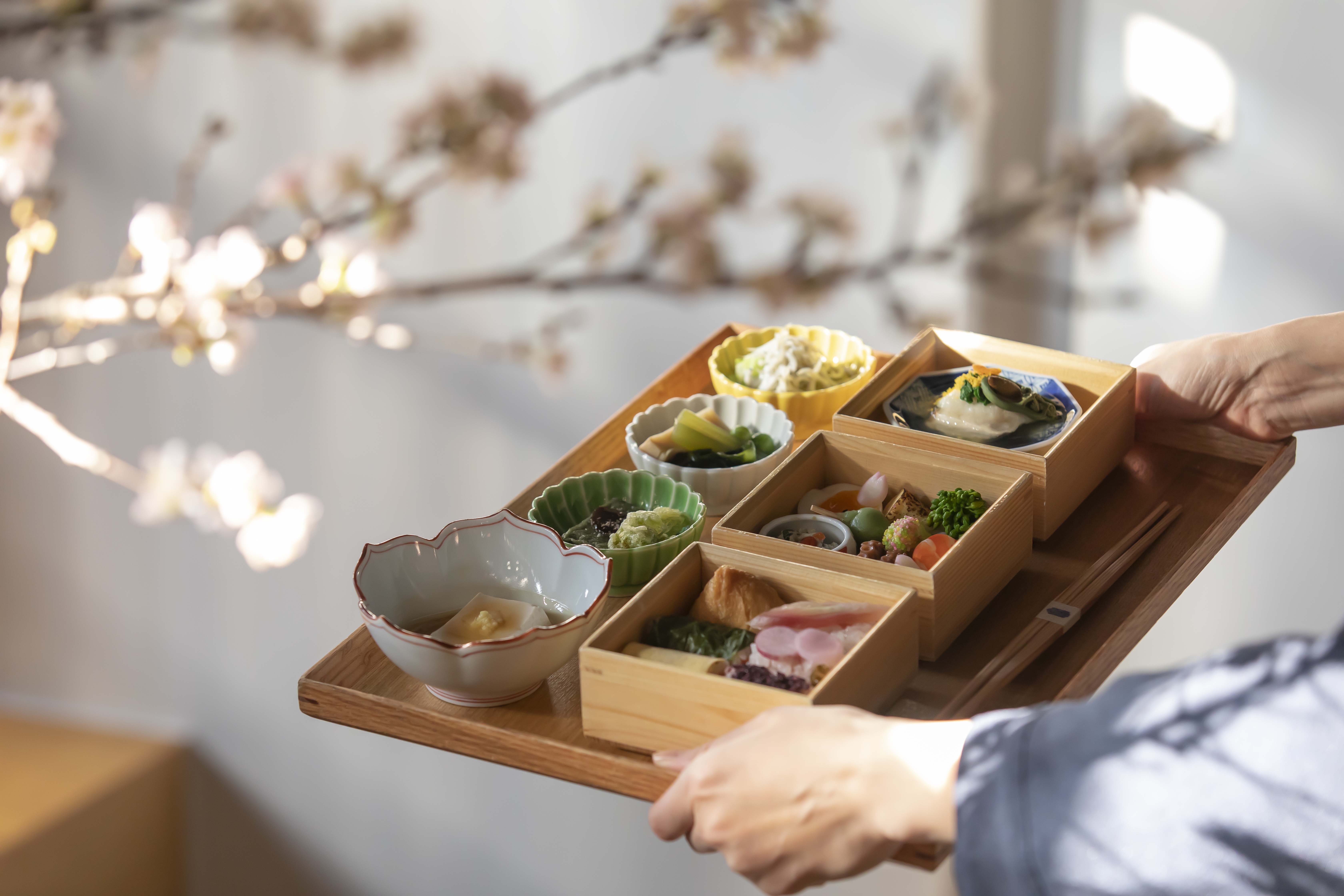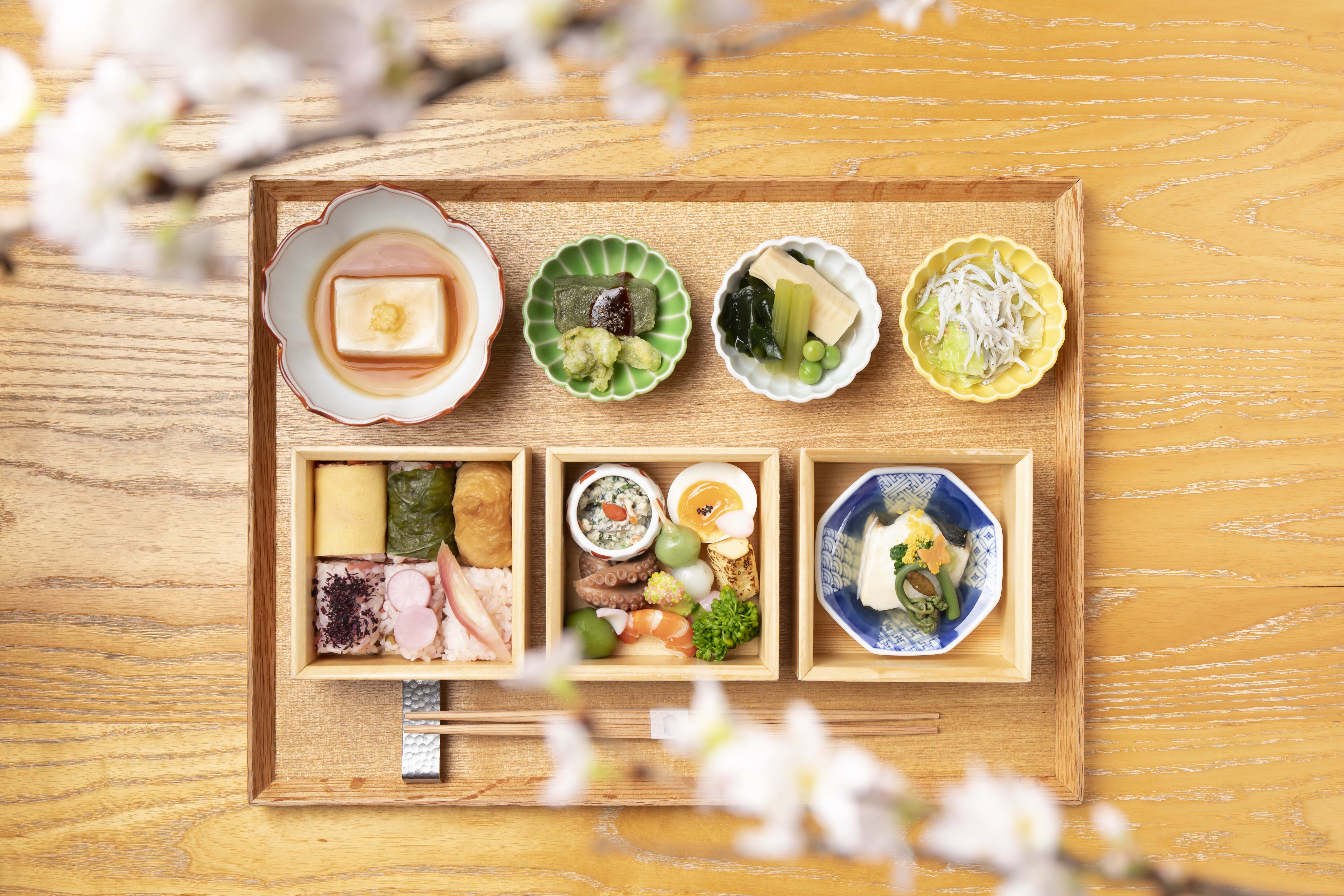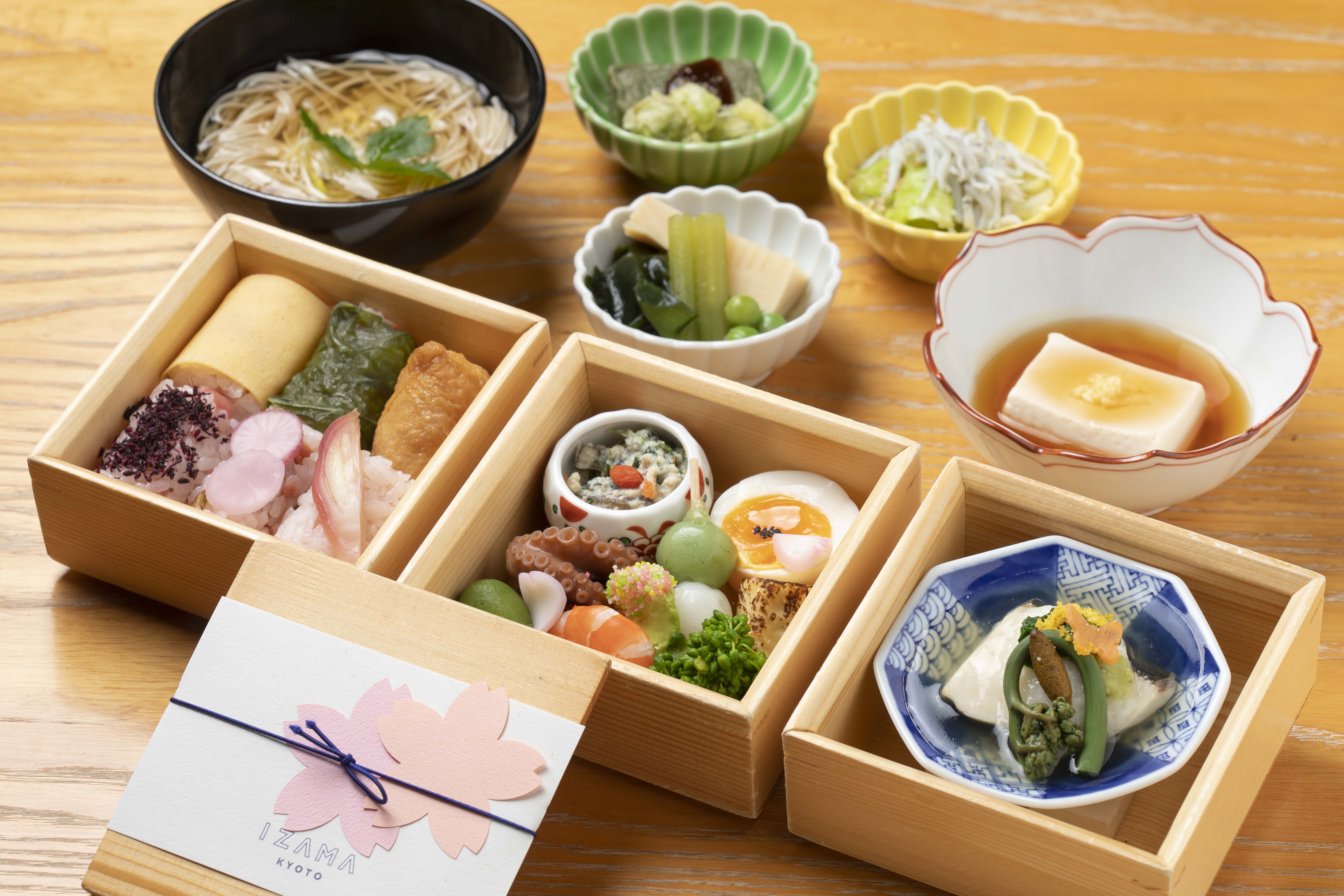 季節毎に旬の食材を取り入れた“おばんざい”がお楽し頂ける「居様/IZAMA」の看板昼食メニューを、京都の桜が開花する時期に合わせ、「お花見」をテーマに特別仕様でご用意いたします。主役となる三段のお重には桜の風味を目で感じ味わえる「彩り桜ちらし寿司」や旬の鰆に大和芋をかけて蒸した「鰆の大和蒸し」など色鮮やかな料理をぎゅっと丁寧に詰めました。また、春のおばんざい御膳を彩る小皿には京都の豊富な地下水を使用し昔ながらのにがり製法で作り上げている「平野とうふ」の豆腐を使用した「豆腐餡かけ」をはじめ、独特な香りと苦味を持つ春の食材である蕗のとうを使用した「よもぎ麩 蕗のとう白扇揚げ」や「春キャベツのおひたし」のほか、新筍と新若布を合わせた「若竹煮」などをご用意した春限定のおばんざい御膳です。
