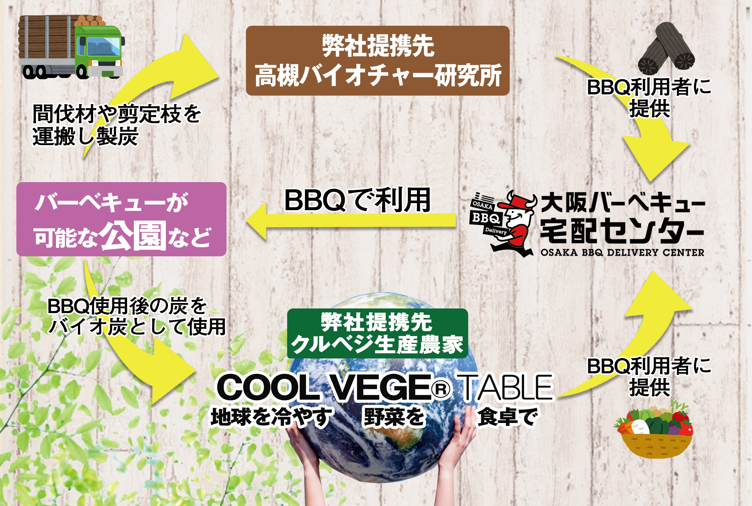 BBQで使う木炭のうち、消し炭として処分する割合は存外馬鹿に出来ない量である。これをどうにか再利用できないかと考え、炭を使った農業に辿り着きました。炭を農地に散布することでCO2を削減し、土壌活性効果を促す農法により作られるクルベジ®︎(COOL VEGE)に弊社の消し炭を再利用して頂けることになりました。今まで木材を調達して製炭していた農家様と、消し炭を再利用して頂きCO2の削減に協力出来るということで、互いにとって最高のパートナー関係を築くことが出来ました。