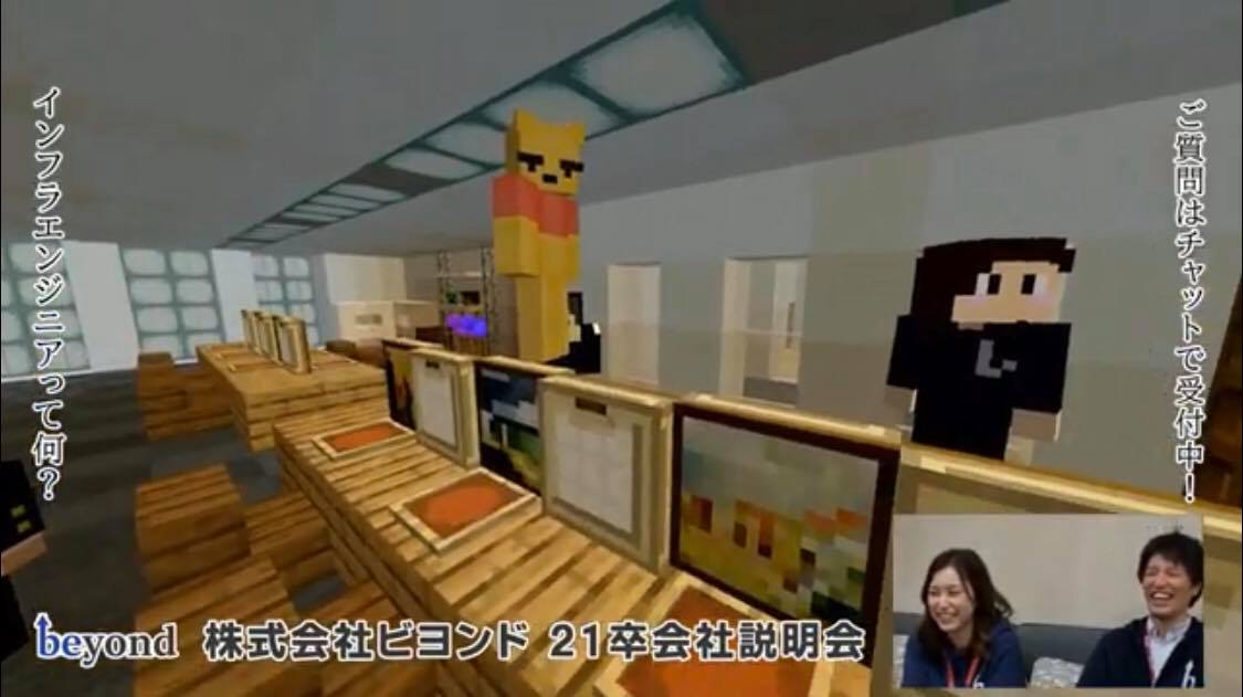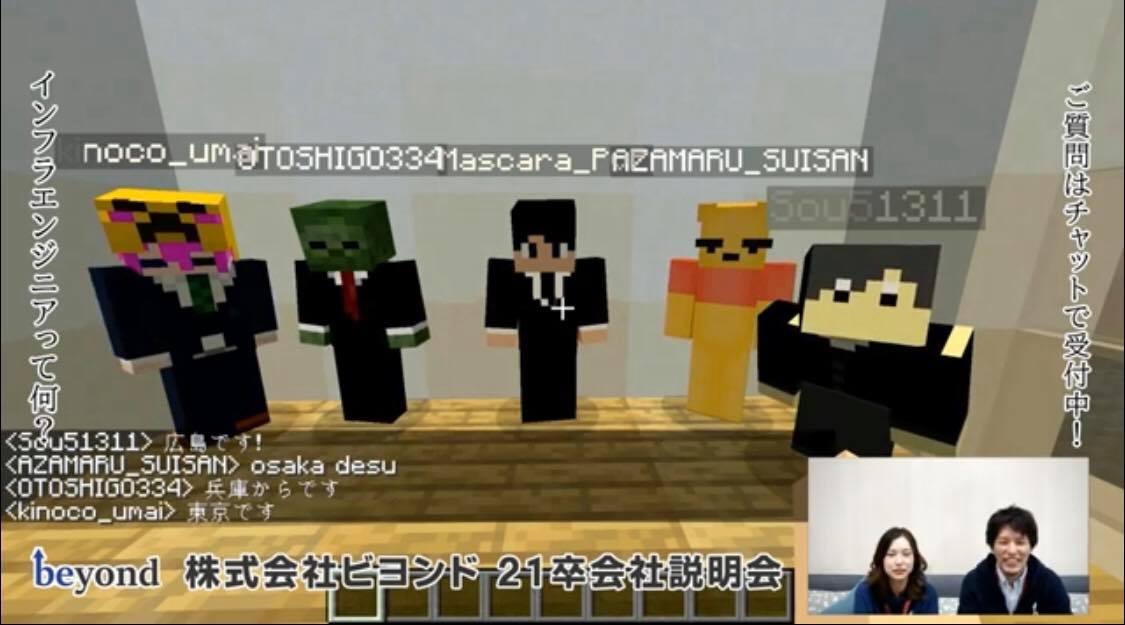 新卒採用の取り組みとして今回新たな試みとして実施した「オンラインゲーム内会社説明会」。通常の会社説明会で配布する資料は壁面ブロックに文字を投影して説明し、質疑応答などはゲーム内のチャットを通じてやり取り。実際の人物ではなく、アイコン同士のやり取りで、通常の会社説明会よりもフラットな雰囲気で進行し、会社説明会後に実施したアンケートでは満足度100%を達成しました。また「オンライン上で聞けてとても楽でした」「新鮮で楽しかったです。ありがとうございました」などのコメントもいただき、短時間でお互いの距離を縮ませることに成功しました。