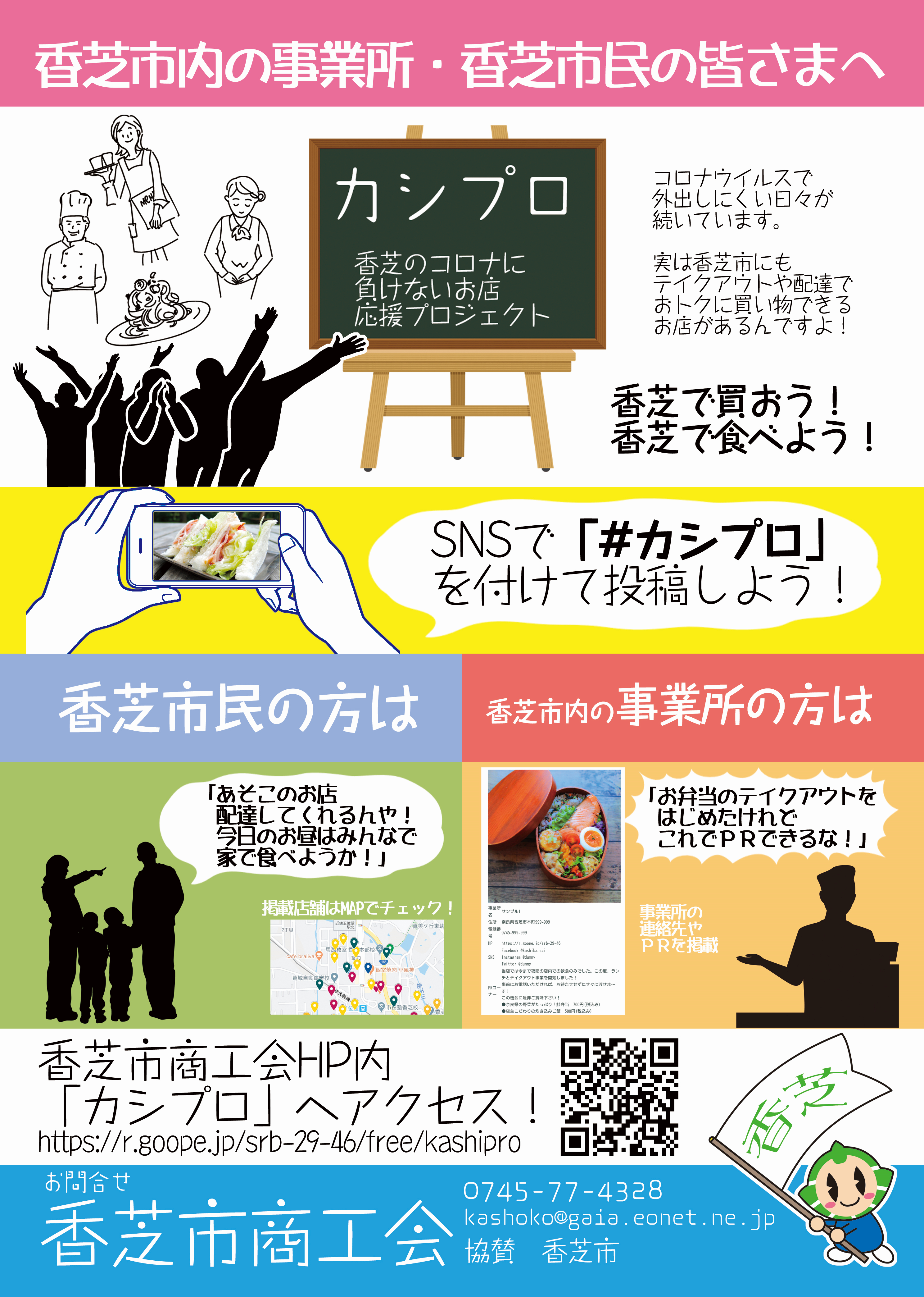 香芝市商工会は新型コロナウイルスに負けない香芝市の事業所を市民へ周知するサイト「カシプロ ~香芝のコロナに負けないお店 応援プロジェクト~」を、香芝市商工会HP内に開設したことをご報告いたします。
