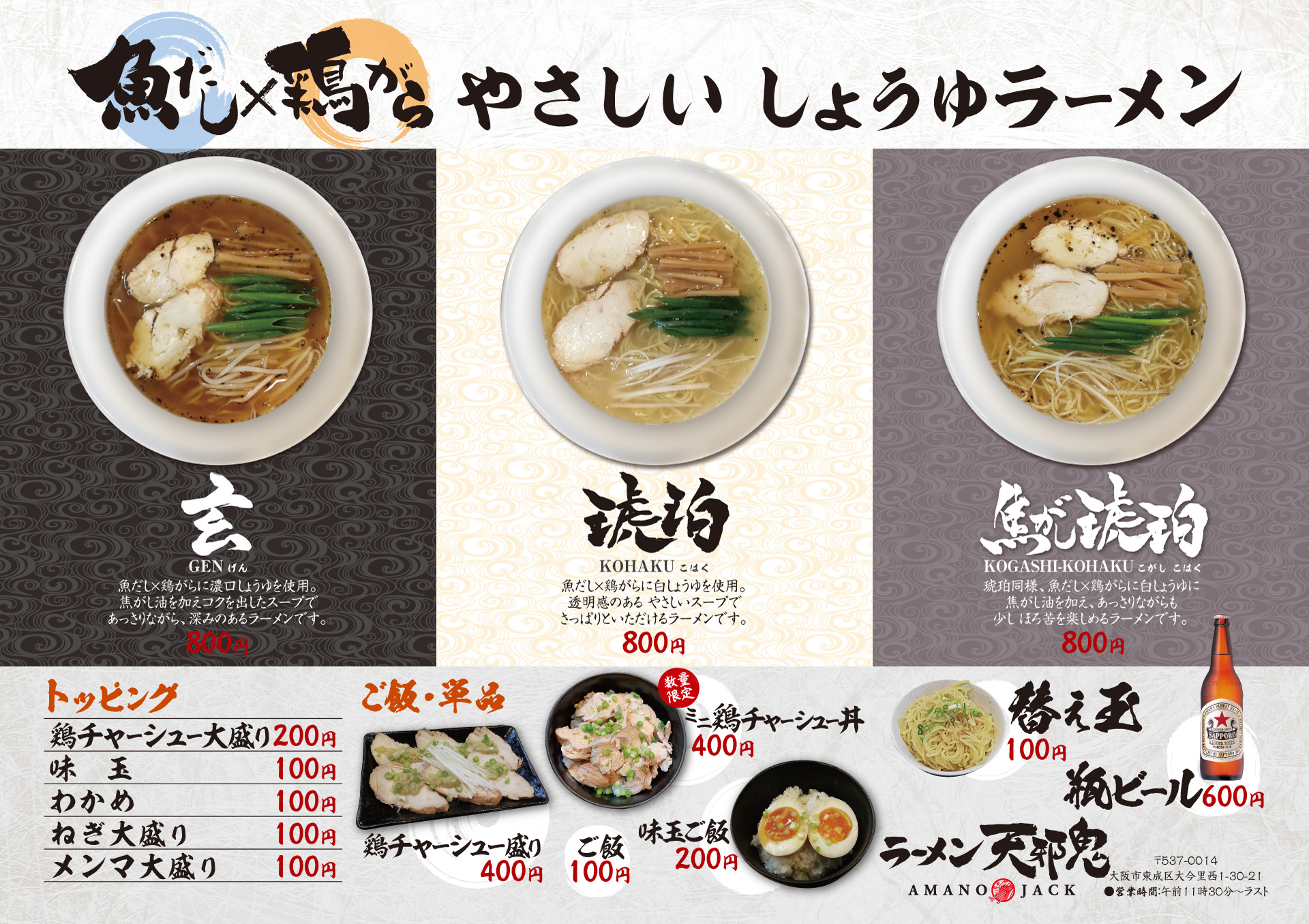 “あっさり”しているのに“深いコク”の透明なスープは、魚だし×鶏がらを絶妙にブレンド。味は3種類ご用意。麺はスープに合わせて中細麺と細麺を使用。ホロリとトロケる国産鶏チャーシューは自家製。女性でも最後まで飲み干せるやさしいスープのしょうゆラーメン「ラーメン天邪鬼(アマノジャック)」が大阪市東成区大今里に4月8日オープンしました。
