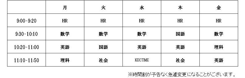 そこで、私たちは学校としての役割も担うべく「KECオンラインスクール」を、小学5年生~高校3年生を対象に開校することにしました。毎日決められた時間割で、授業だけでなく、朝の会、帰りの会を行うことで生活リズムを確立しつつ、ICT教材による映像授業で基礎・基本を徹底。学校生活の再開に向けた準備としても位置付けております。