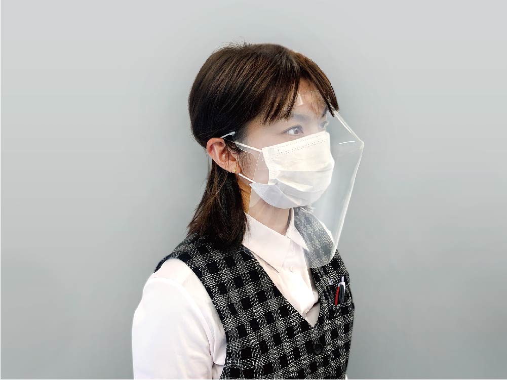 今回新型コロナウイルスの飛沫感染防止の為にラミネートのフェイスマスクを企画しましたのでご案内いたします。世界的に新型コロナウイルスの感染が広がり日本でも医療崩壊の危機が迫り医療マスクや防護服なども不足している中、最前線でウイルスと戦っている全医療関係者のために弊社でも何か役に立てないかと考えテレビ会議を通じて全支店での緊急会議を設けまた。その中である社員から出たラミネートフェイスマスクの案を採用し今回商品化まで辿り着きました。せっかく商品化するのであればもちろん使いやすく医療業務の妨げにならないことを第一に考え試行錯誤する中でオリジナルの形を生み出しました。実際に医療現場で働く看護師の意見を考慮し装着する上で顔とラミネート部にある程度の間を取ってあげることで息苦しさや圧迫感、曇りなどをなくし医療に集中してもらえるような商品となりました。さらに、ラミネート会社だからこそできるコストメリットを十分に考慮し使い捨てでも負担にならない価格(@250/枚)に設定することができました。