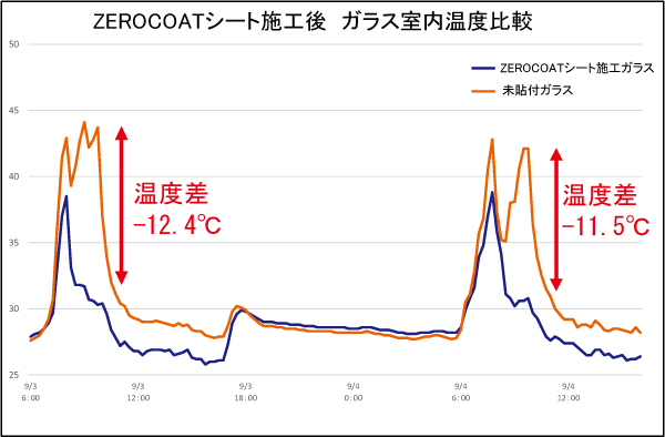 軟質塩ビシートに独自技術である紫外線と近赤外線を吸収する金属ナノ粒子を練り混ぜてZEROCOATシートを製造しています。ZEROCOATシート貼付後はガラスの透明性を保持しながら紫外線を約99%カット、近赤外線を約70%カットします。実際に施工した窓ガラスの室内側温度を測定した結果、最大12℃の温度差がありました。