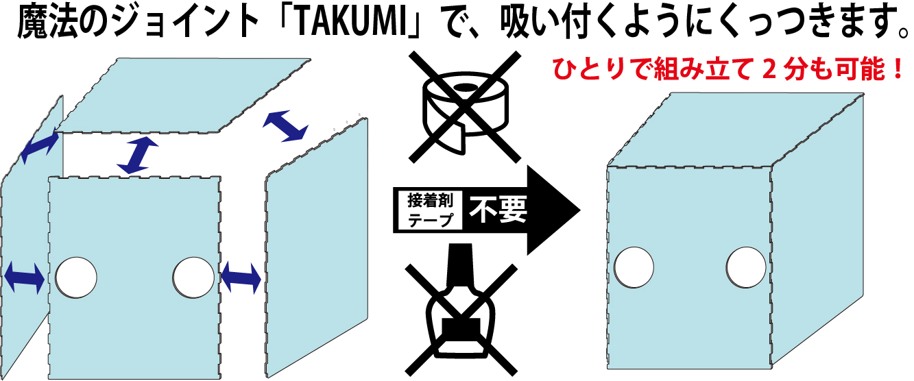 開発を組み込み、実用化に成功。接着剤を使わずに素早く組み立てが可能な点で、使用後は簡単に分解できコンパクトに保管できます。