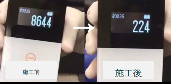 ✓コーティングするため、ウイルスが付着しない。また光触媒の効果によりセルフ除菌されるため、