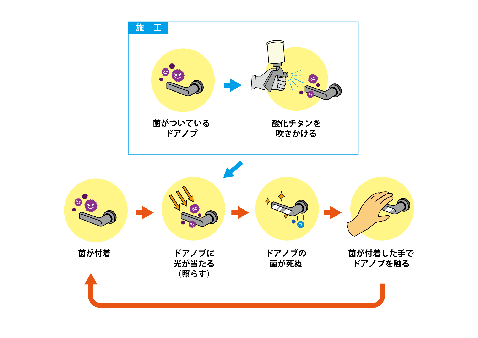当研究所では、即効性のある次亜塩素酸水による除菌のほか、新たに「光触媒コーティング」を中心とした除菌・防菌作業を行います。「光触媒」は酸化チタン・水・極微量のエタノールが成分で、室内のLEDや蛍光灯などの光を吸収し、反応で付着したウイルスや細菌などを安全なH²Oに分解する仕組みです。光触媒コーティングは持続的効果もあり、防菌、防臭、防汚、防ウイルス、防カビ効果が最大2年間持続します。また、酸化チタンは食品添加物のため、人体に無害でお子様やペットのいる家庭でも施工が可能です。 光触媒効果によりセルフ除菌される為、空吹きや水拭きなどの簡易清掃で対応可能です。