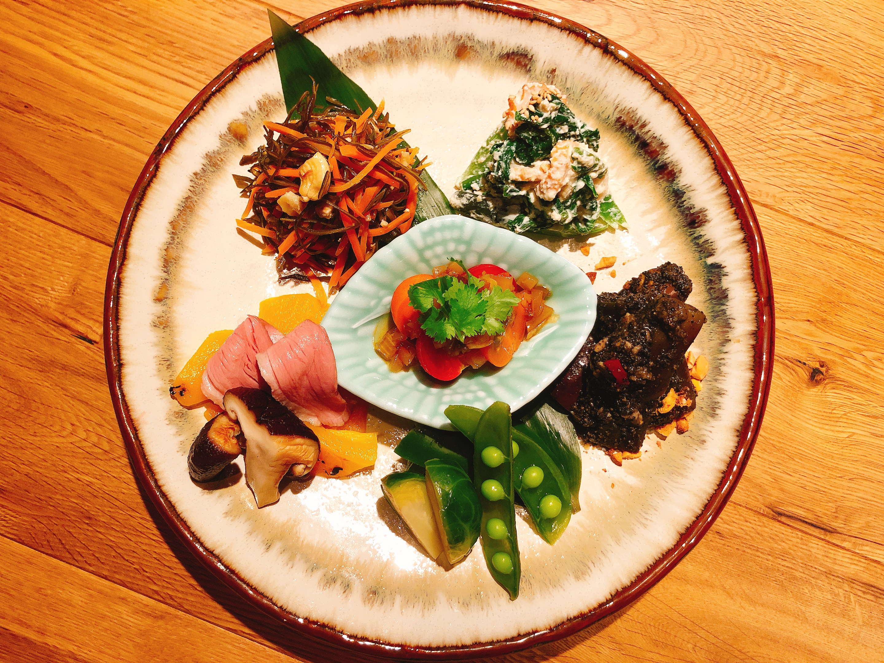 店主の妻が作る、季節の野菜をたっぷり使った体に優しいおばんざい。日替わりの6種盛。