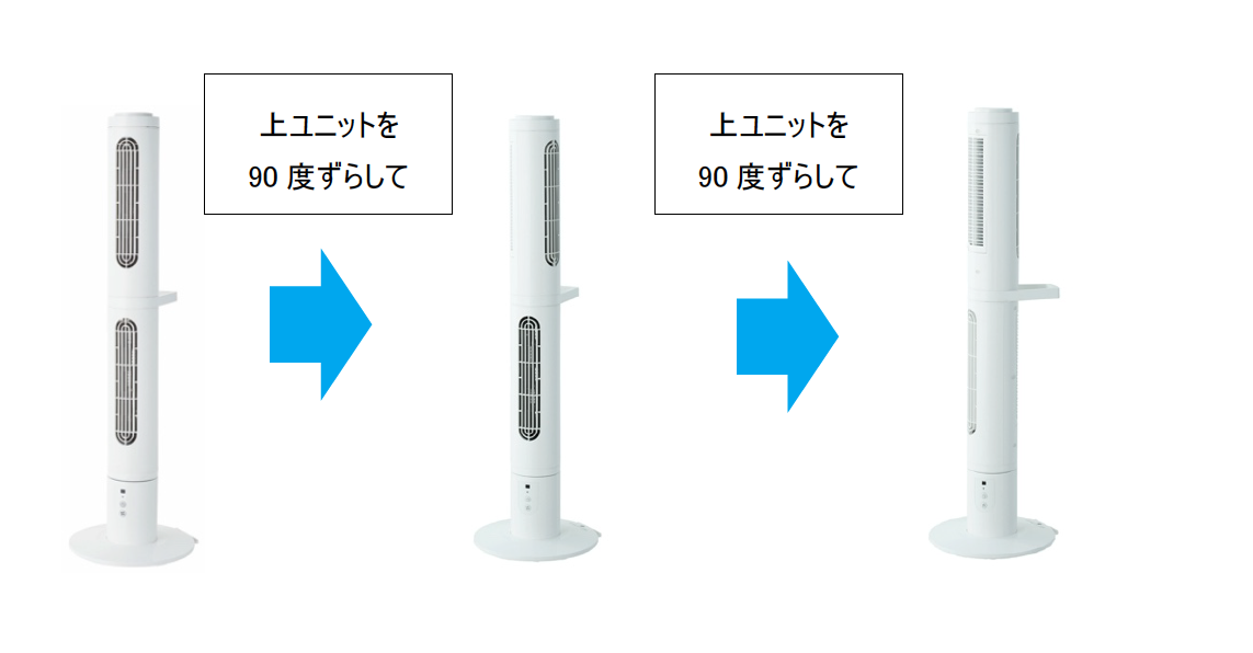 例えば、下段のユニットと上段のユニットを90度ずらす事により、首振り機能と合わせて約170度の範囲に風を送る