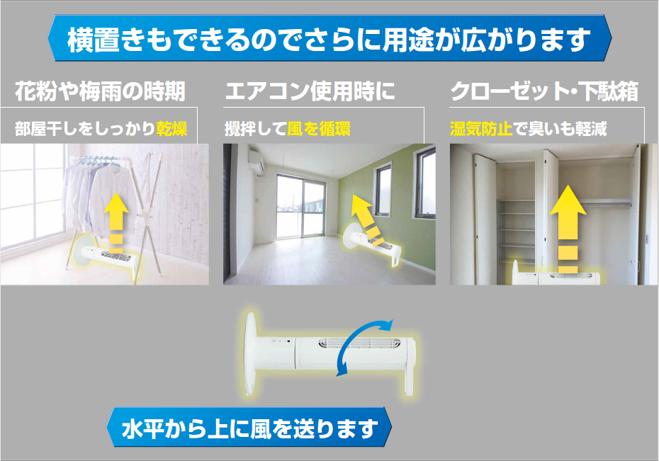 を送る事ができます。洗濯物の乾燥時は真下に置いたり、エアコンの風も上下に攪拌、クローゼットや下駄箱には湿気