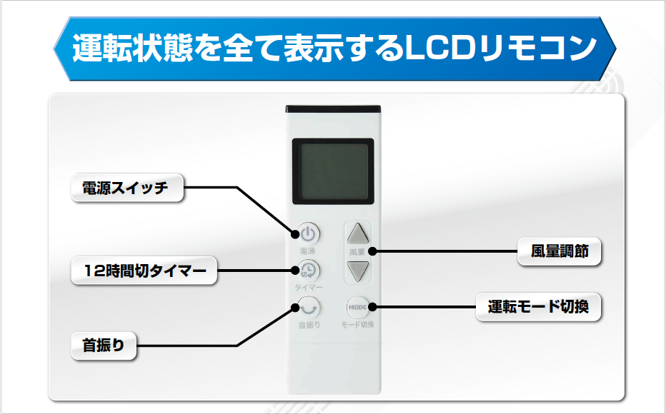操作は出来る限り移動しなくても運転状態が一目で分かるようにLCD リモコンを搭載。リモコンに全ての運転状態が