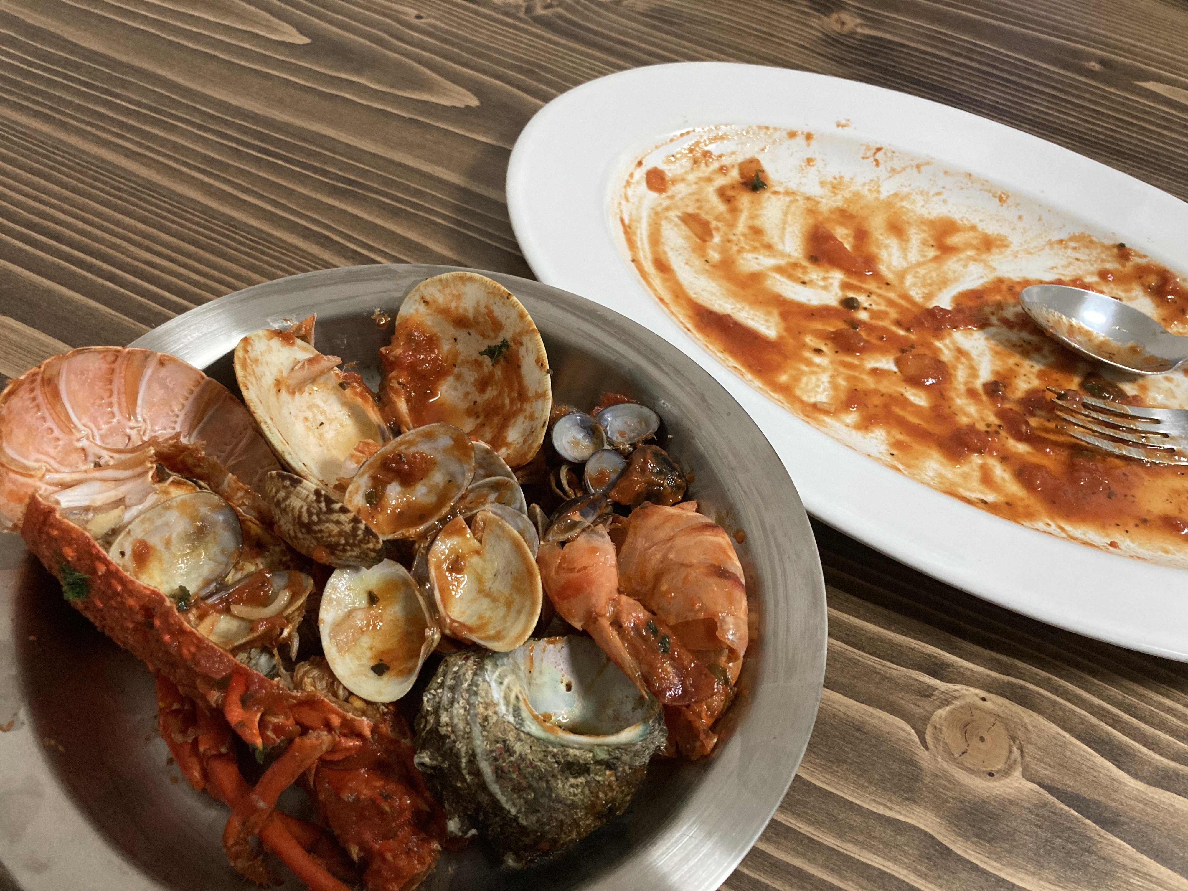 ロブスターや、ブラックタイガーなどをトマトソースで煮込み、それとは別にナポリタンを作るので作業は2倍。仕入れから提供、殻の処分まですべてが面倒です。ただ、当たり前にひたすら美味しいです。