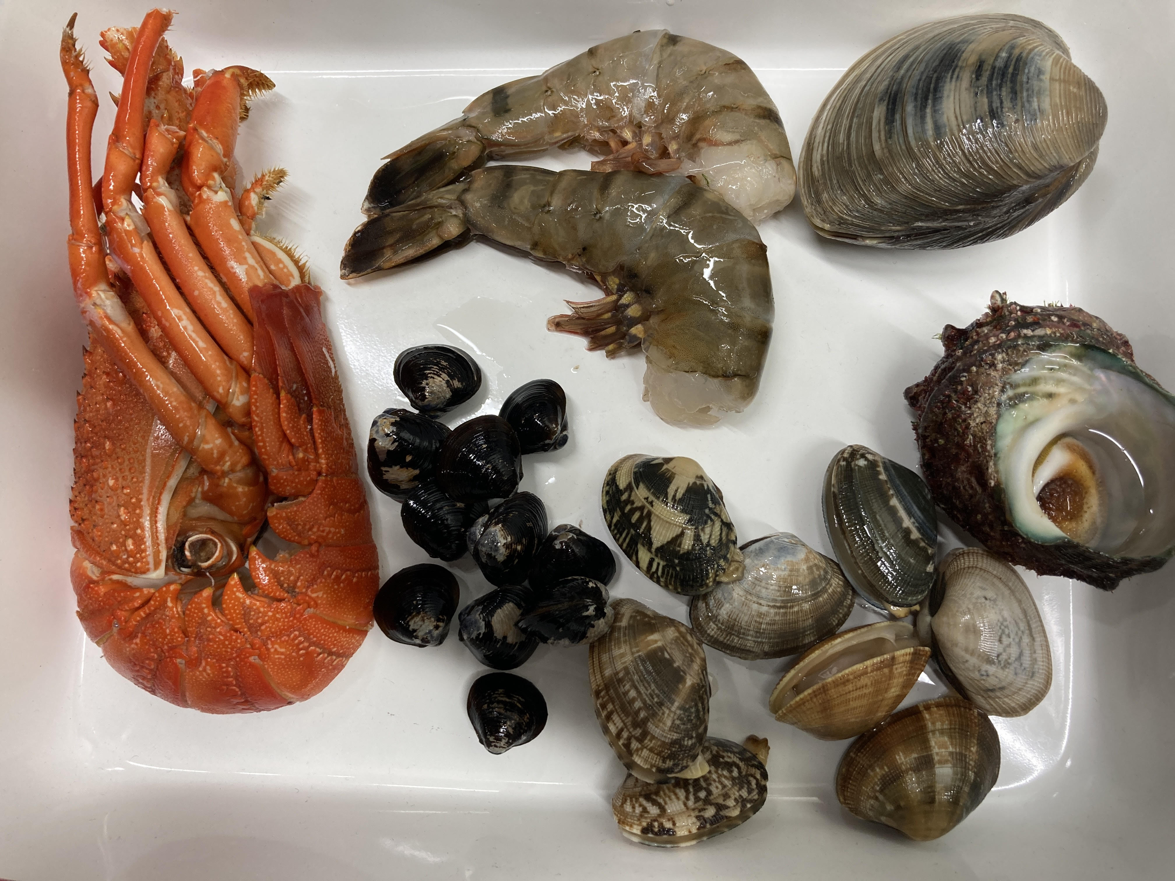 手 順:①:殻付きロブスター、ブラックタイガー、サザエ、ムール貝などを