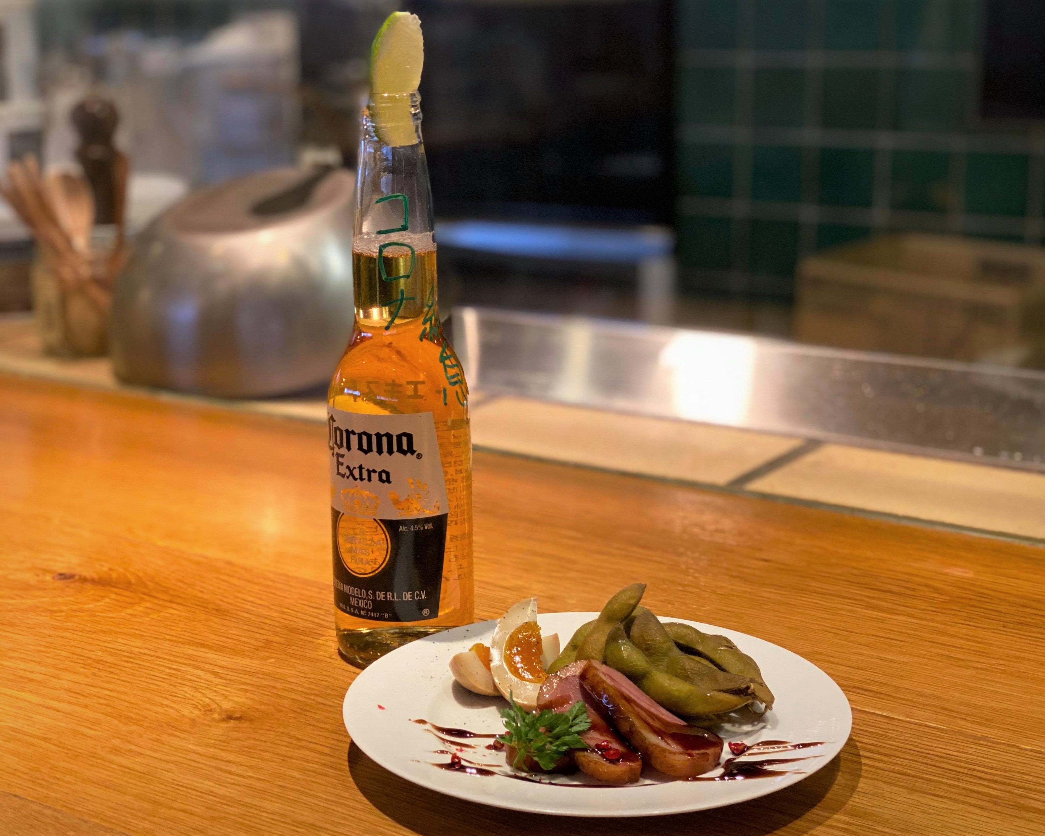 当店は、自家製の燻製を、さらに鉄板で焼いて提供するため、スモーキーな香りが店内に漂います。香り高い燻製とスッキリと軽い味わいのコロナビールとの相性はよく、人気の組み合わせです。