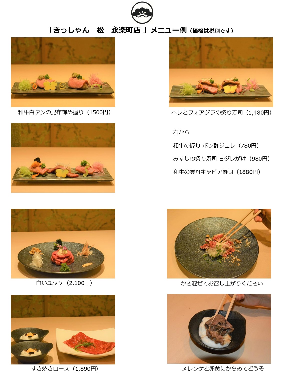 当店の魅力のもう一つ、それは「松阪牛」を”ほぼ丸ごと”楽しめる点です。2016(平成28)年から松阪牛にも力を入れ、弊社が運営する北新地の2店舗で提供しております。松坂牛の「サーロイン」「ヘレ」のみなど部分飼いするお店はたくさんありますが、ホルモンやタン、シャトーブリアンなど幅広くそろえるお店は大阪ではほとんどありません。