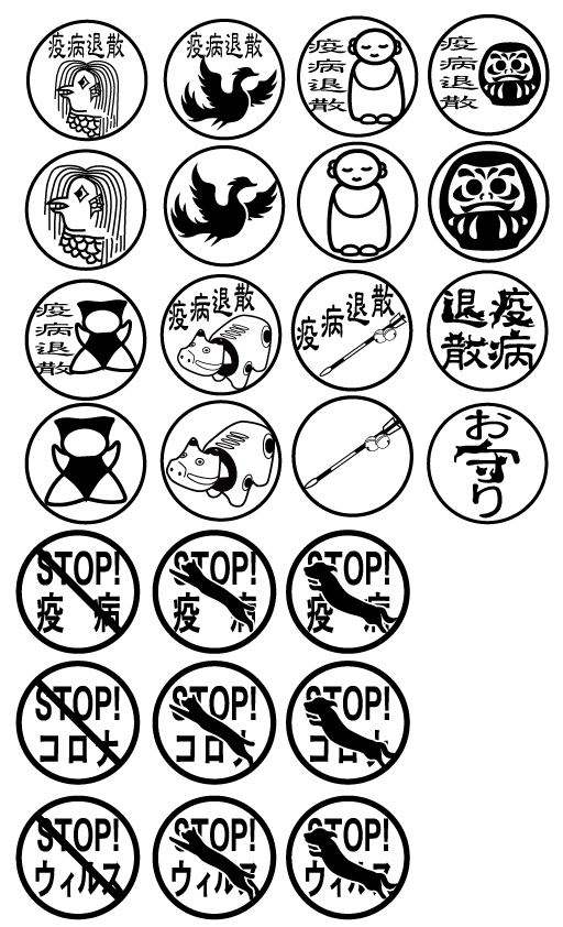 2)「STOP疫病」「STOPコロナ」「STOPウイルス」それぞれの文字と、通行止め標識などのデザインを組み合わせたもの。(9種)