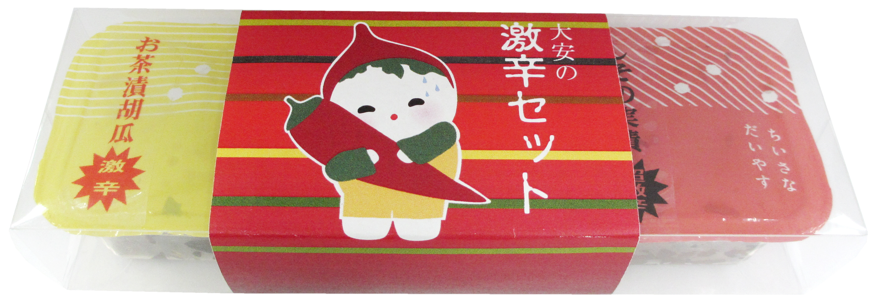 「味すぐき」「しその実漬」「お茶漬胡瓜」の3種の既存商品に、鷹の爪の約10倍の辛さといわれる唐辛子「ハバネロ」を加えた『激辛味』と、鷹の爪の約20倍の辛さといわれる唐辛子「ブートジョロキア」を加えた『超激辛味』を用意しました。