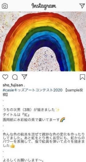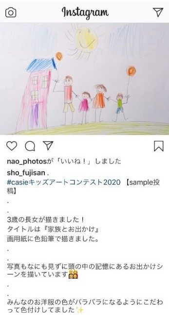 そこで、当社は夏休みのワクワクするイベントの1つとして、気軽に参加できるアートコンテストを企画しました。キャンバスでも画用紙でもコピー用紙でもチラシの裏面でも構いません。鉛筆でもボールペンでもサインペンでも絵具でも構いません。お子さんが描いた絵を「#casieキッズアートコンテスト2020」のハッシュタグを付けてInstagramに投稿するだけでエントリーが完了します。遊びに行かれなくても親子のコミュニケーションで生まれたアートで思い出作りをしてみてはいかがでしょうか。