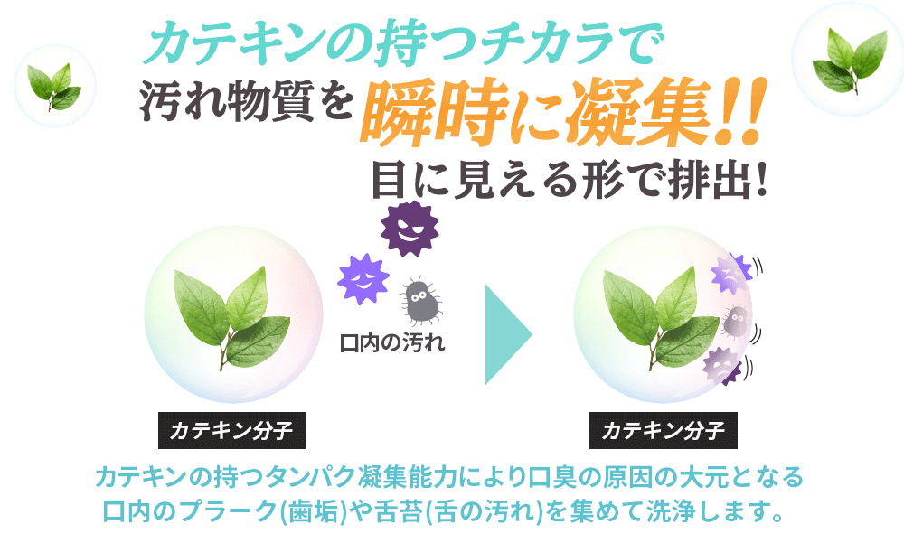 カテキンの持つチカラで汚れ物質を瞬時に凝集し、臭いの元を目に見える形で排出!
